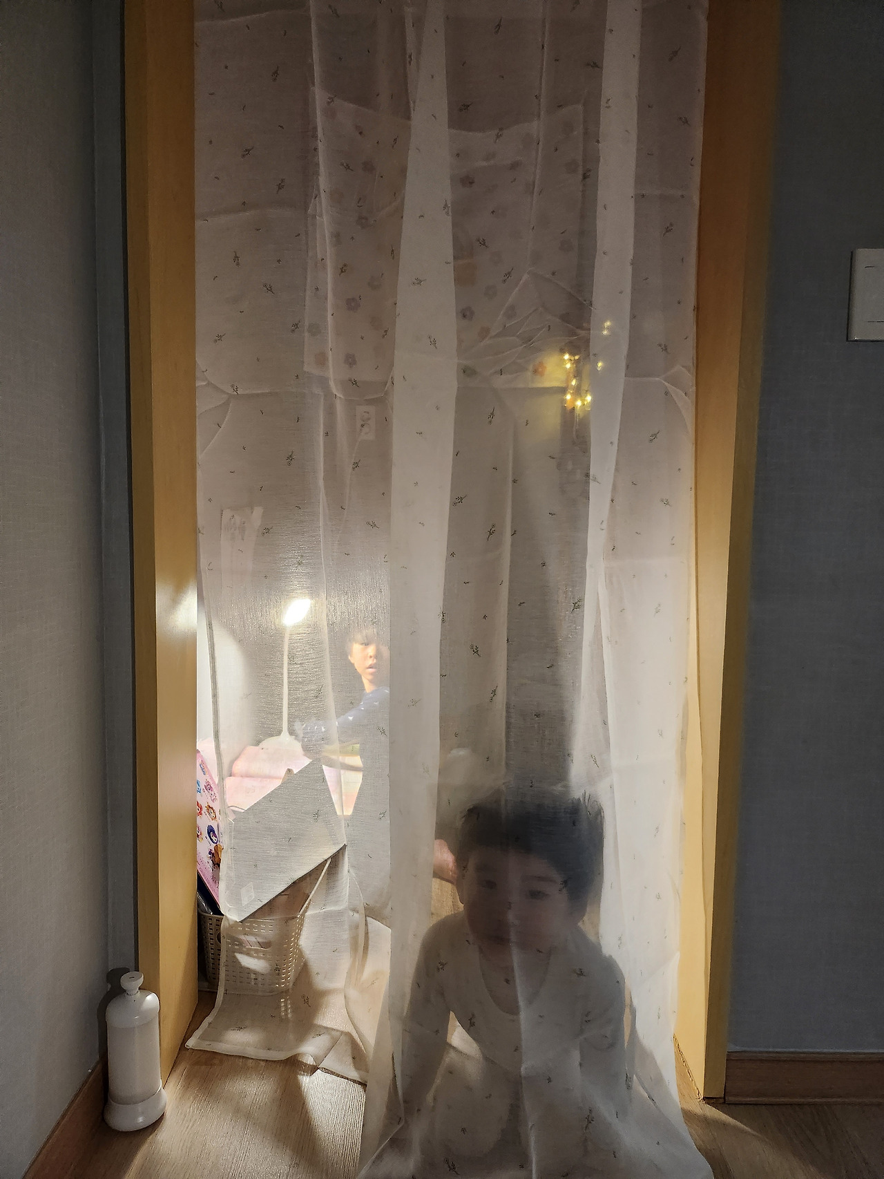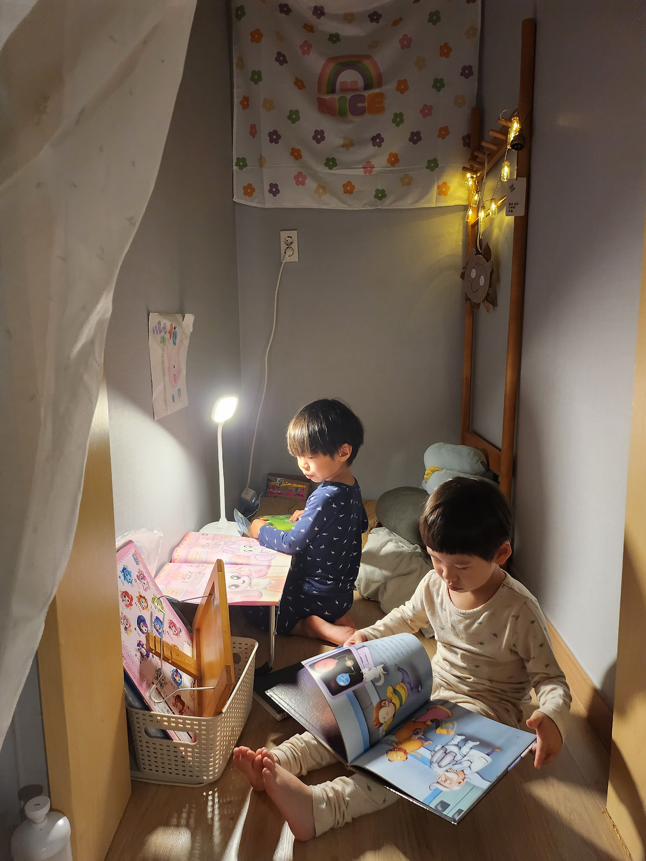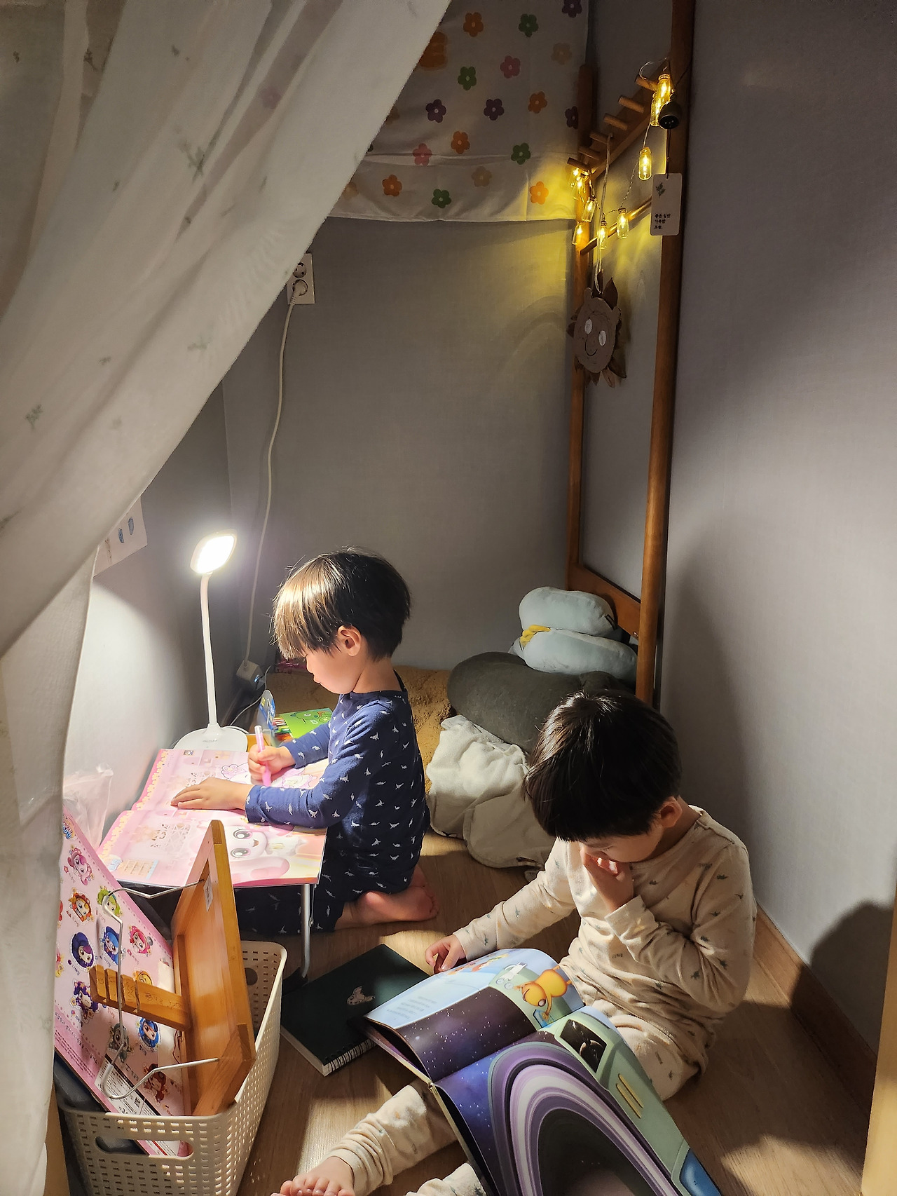 다행히 예상보다 아이들은 더욱 좋아하였고, 자꾸 커튼을 열지 말라며 꼬옥 닫고는 책 보기, 색칠놀이, 아끼는 인형들을 초대하는 등 자기들끼리 알콩달콩한 시간을 보내고 있다. 잠도 저기서 잔다고 고집부려 잠든 아이를 들어 침대로 옮긴다. 아동심리나 교육학을 전문적으로 공부한 적은 없지만, 아이만의 작은 공간은 나만의 공간이라는 독립심과 자궁 속 같은 본능적 편안함으로 인해 창의성을 기를 수 있을 것 같다.