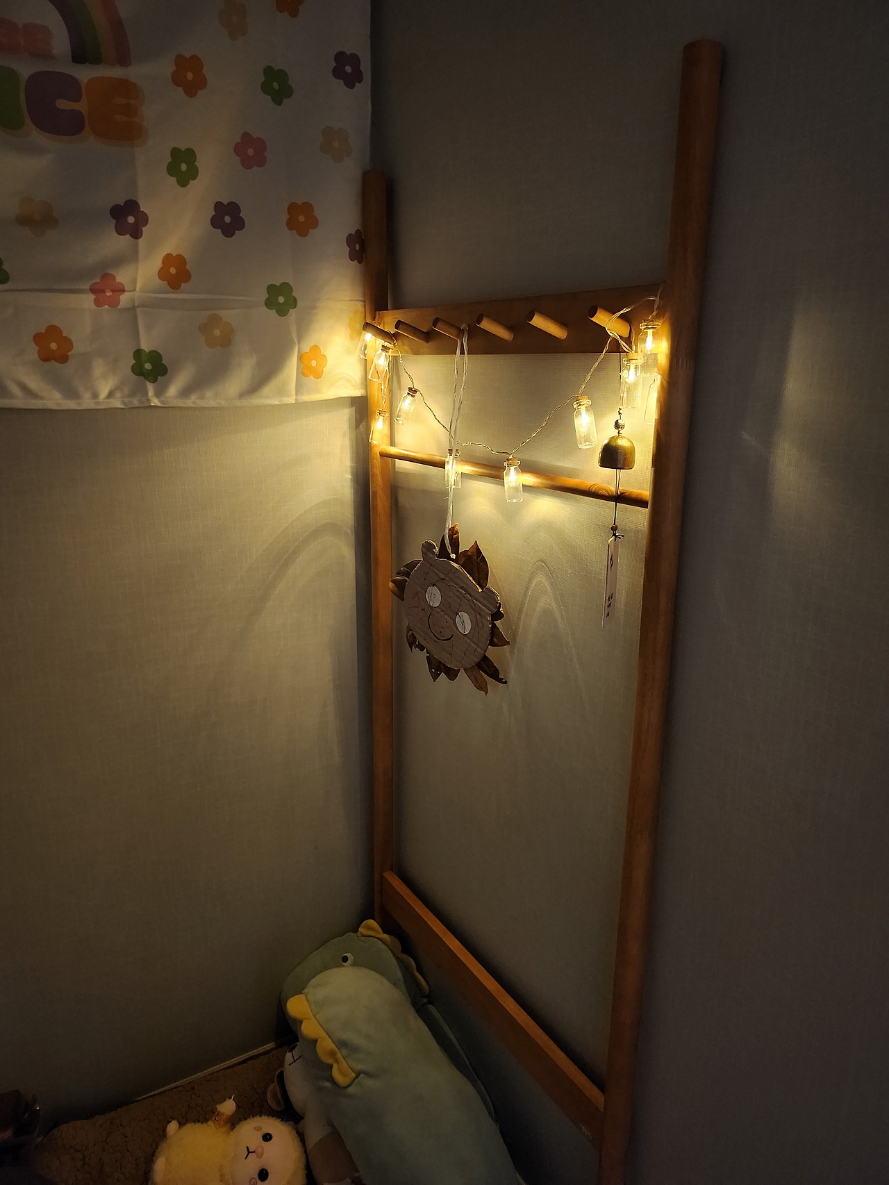 한 달만 머물고 갈 곳이라 최소한의 비용과 짐으로 가장 효과적으로 꾸미기 위해 다이소를 이용하였다. 커튼, 가랜드, 알전구, 종 등등을 사 아이들이 어린이집에서 돌아오기 전에 서프라이즈로 준비해 두었다. 그리고 어린이집에서 돌아오는 길 차에서 낮잠에 빠져든 아이들이 잠에서 깬다.