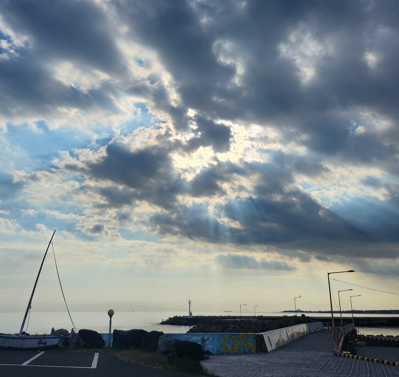 3년 전쯤 육아휴직 중에 브런치 작가신청을 한번 하였다가 떨어졌던 경험 때문인지 설레임보단 불안함을 가지고 아이들 하원 시간에 맞춰 데리러 가는 길. 해안길로 운전 중 구름이 가득 낀 하늘에서 햇볕이 틈을 열고 비집듯 터져 내려온다. 그냥 지나칠 법도 한 여느 하늘이었지만 예사롭지 않게 느껴졌다. 굳이 가던 차를 갓길에 세우고 담기지 않을 걸 알면서 카메라를 켜본다.