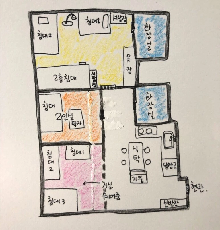 내가 사용한 곳은 노란색 방이다. 여성 4인이 같이 사용하는 방으로 화장실이 방 안에 달려있다.
