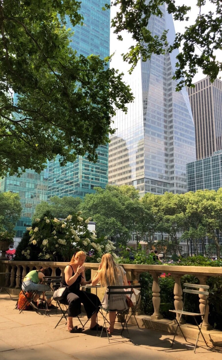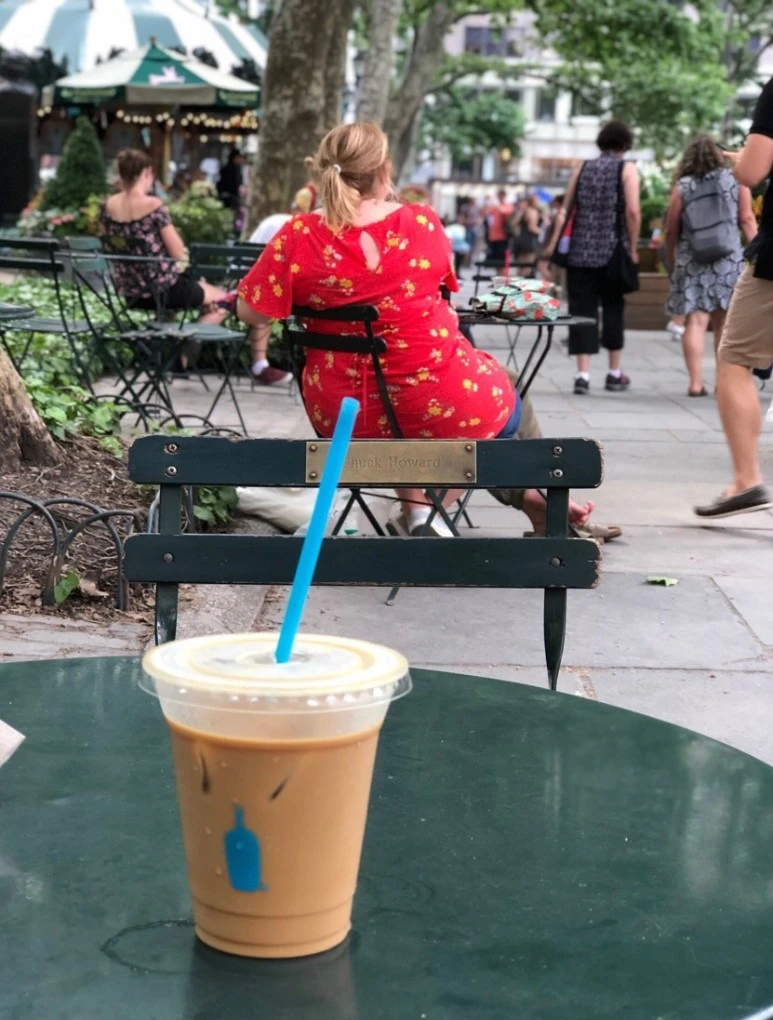 브라이언트 파크 근처에 블루보틀 커피도 있다. 뉴올리언스 한 잔 사서 공원에 앉았다. 녹색 테이블과 의자가 많다. 혼자 온 사람, 친구나 동료와 같이 온 사람들, 뭔가를 먹는 사람들, 책 보는 사람, 노트북으로 뭔가를 하는 사람, 큰 플라타너스 위로 보이는 빌딩들, 넓은 잔디밭, 뉴욕이다.