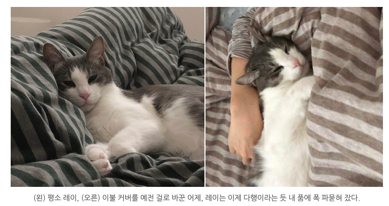 그런데 우리가 알러지 케어 이불로 바꾼 첫 날, 레이는 이불을 거부하듯이 침대에 오지 않고, 거실 스크래처에서 자기 시작했다. 자다가 오는 경우도 있으니 새벽에 오겠지 하고 자는데, 새벽에 레이가 억울하다는 듯이 길고, 크게 울었다. 이불이 마음에 안들어~, 엄마 아빠랑 같이 자고 싶은데 갈 수가 없잖아~~라며 길고 크게 계속 울었다.(정말 이렇게 말했다.)