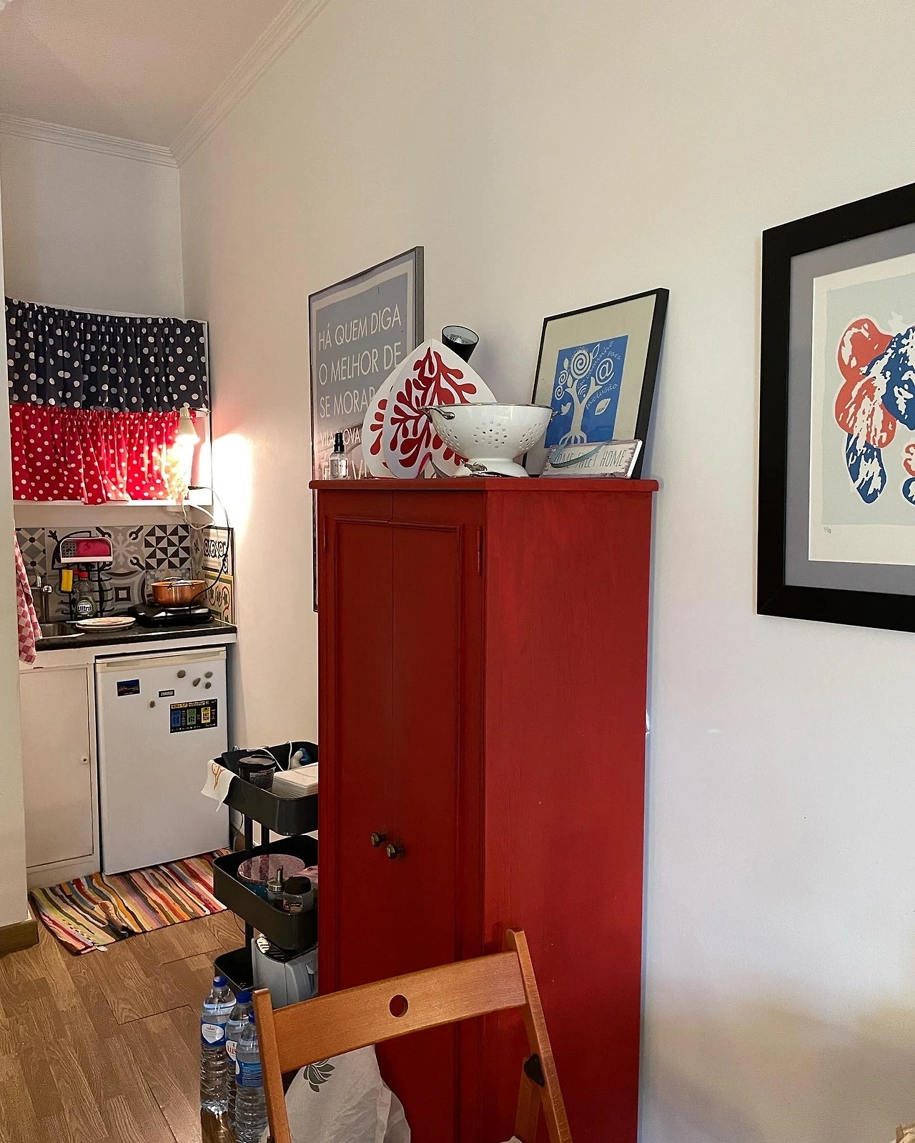 한쪽 구석에 아주아주 작은 개수대와 가열할 수 있는 플레이트 하나. 냉장고와 전자레인지.