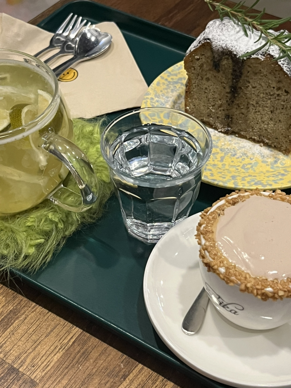 이미 커피를 6잔 이상 마신 상태라서 더 이상 마시기 힘들었지만 그래도 왔으니 한 잔은 해야 하니까 고민고민하다가 <Fika소>라는 메뉴가 있길래 주문했다. 짝꿍은 커피를 마시지 못하기 때문에 청귤차를 주문했다. 그러고 보니까 제주에서 방문했던 카페들 중에서 청을 직접 담가서 판매하는 곳이 대부분이었다. 진짜 하나부터 열까지 수제인 곳들이 대부분이었다. 이 정도는 해야 제주에서 살아남는 것인가,, 그리고 얼그레이 파운드케이크를 주문!