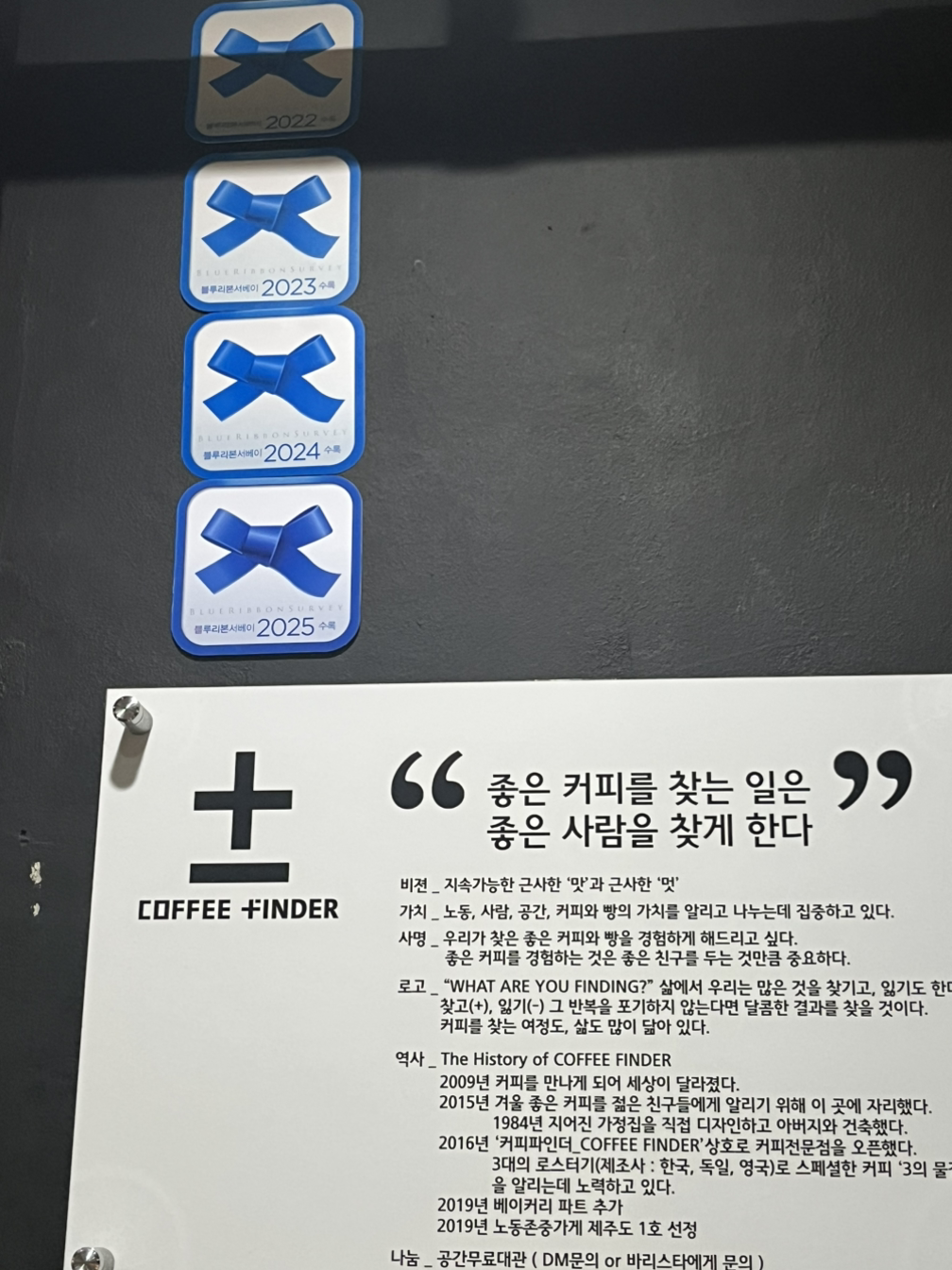 일단 카페의 존재의 이유가 명확하다. 사장님의 비전과 가치가 명확하게 느껴지는 부분이다. 비전과 가치만으로 살아남을 수는 없었을 것이다. 2022년부터 2025년까지 블루리본을 받으셨다.