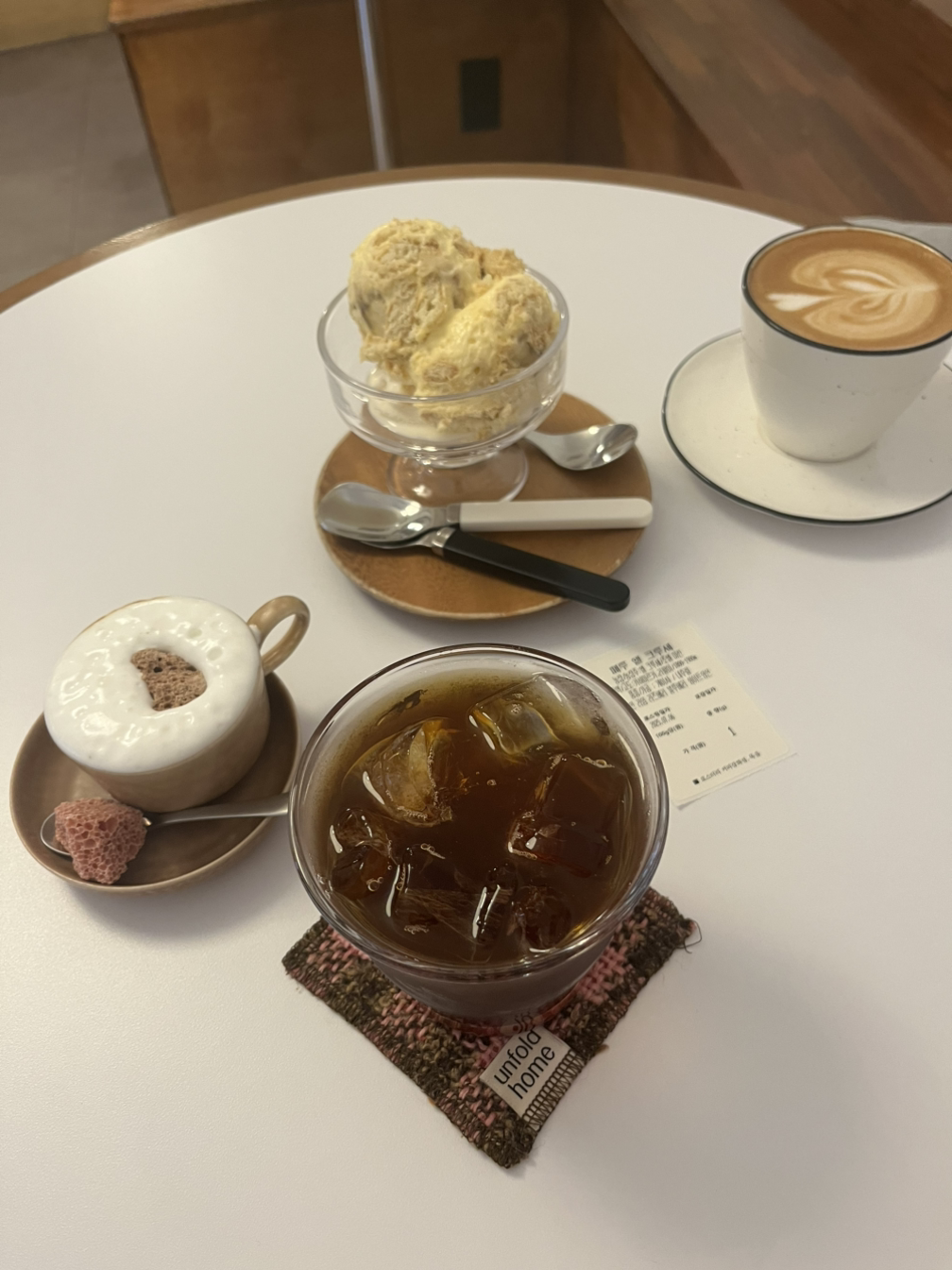 짝꿍은 커피를 마시지 않지만 가끔 크림이 올라간 음료는 마신다. 그 마저도 본인 취향이 아니면 한 두 입 마시고 말린 하지만 여기는 아주아주 짝꿍의 취향이었다. 커스터드 우유 위에 커피 크림이 올라간 대표 메뉴인 <옷옷>이었는데 꽤나 매력적인 메뉴다. 방문하면 꼭 한 번은 마시는 걸 추천하다.