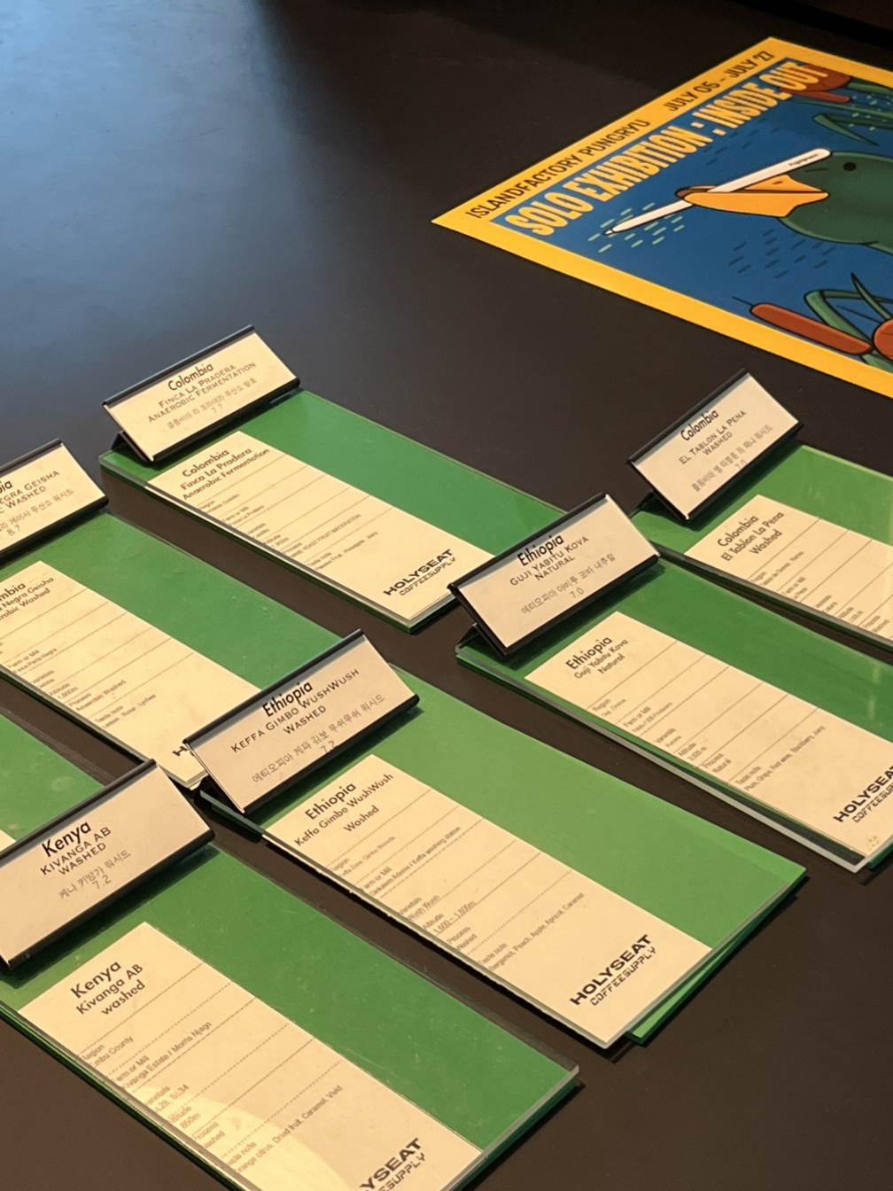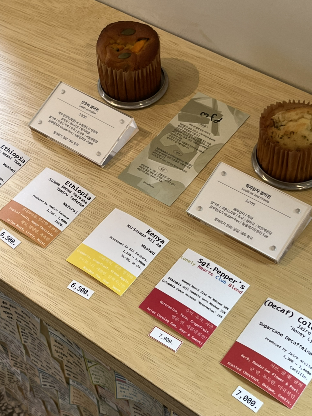 디저트 2종과 원두 5종이 준비가 되어있다. 이번에 카페투어를 하면서 원두를 추천받기보다는 사장님들의 취향을 물어보고 사장님들의 픽을 마셨다. 여기 사장님의 픽은 <케냐 워시드> 보통 워시드를 즐겨 드신다고 하셨다.