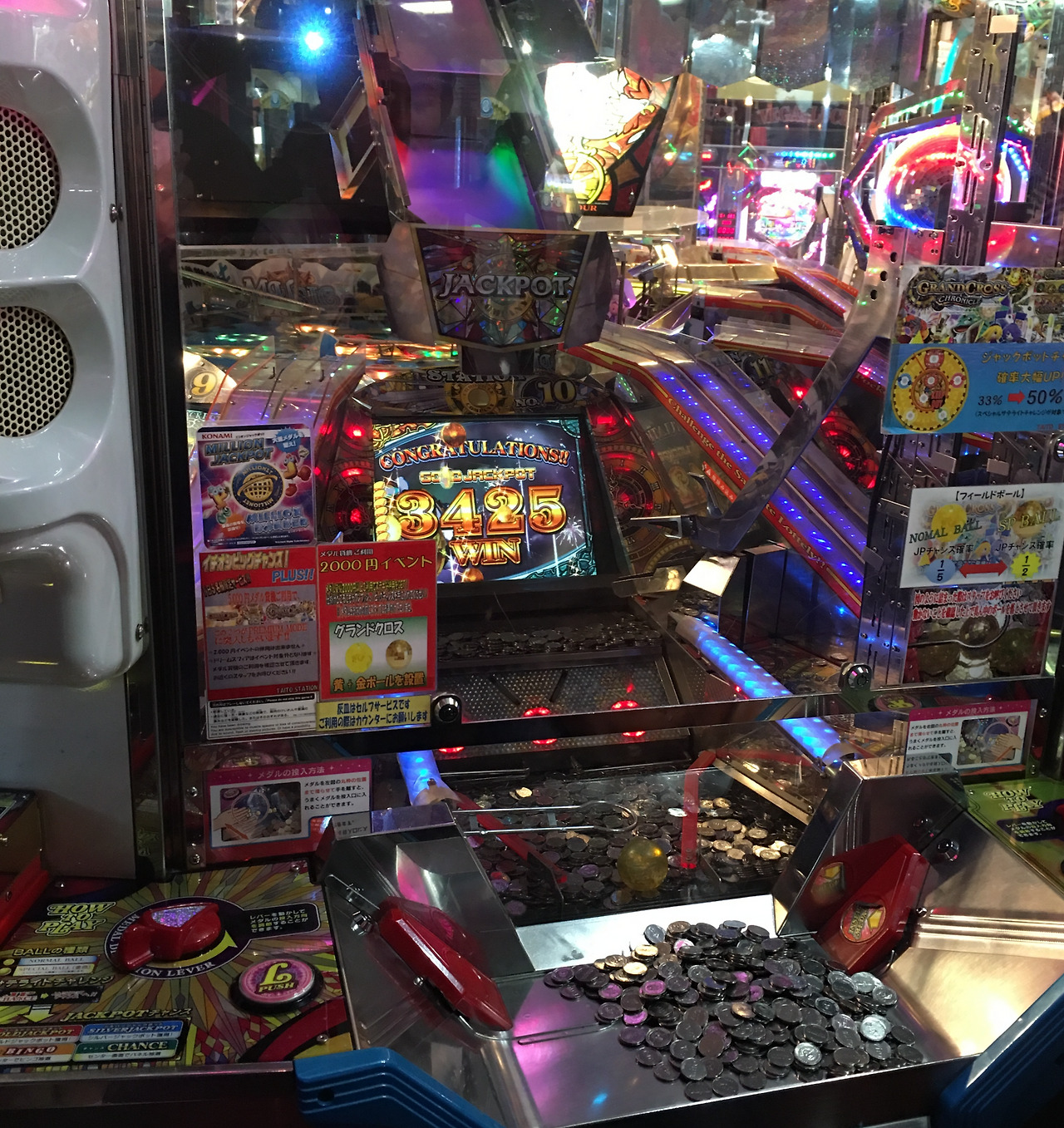 5층에서 나도 한 번 해보고 싶었지만 게임을 할 줄 모르는 데다가 돈도 없었고 애초에 도박과 나는 거리가 멀다고 느꼈기에 그냥 적당히 게임만 일반 게임만 하고 하는 사람들 구경이나 했다. 그리고 어떤 식으로 돌아가는 게임인지는 전혀 모르겠지만 대충 버튼 좀 누르고 운 좋으면 동전이 마구 나오는 게임이 있었다. 누가 봐도 여행객 같은 친구가 하고 있길래 구경을 하고 있었는데 그 사람이 운 좋게도 잭팟이 터져서 동전이 미친 듯이 나왔다. 사진에 나온 동전이 나에게 나눠준 동전이다. 저만큼을 나와 내 친구에게 나눠주고도 본인은 얼마나 많이 챙겨갔는지 감이 올 것이다. 아마 그 친구도 계속 누르다가 잭팟이 터진 거 같다. 코인의 가치가 정확하게 기억은 안 나지만 20개에 1,000엔 이 정도 했던 거 같다. 환전을 해서 보다 풍족한 여행을 즐길 수 있었지만 일단 일본어를 할 줄 모르고 이 코인을 준 친구는 분명히 내가 게임을 즐기길 원했을 것이다. 그렇기에 어차피 해보고 싶었으니 기념으로 1개만 빼고 다 쓸 생각으로 열심히 탕진을 했다.
