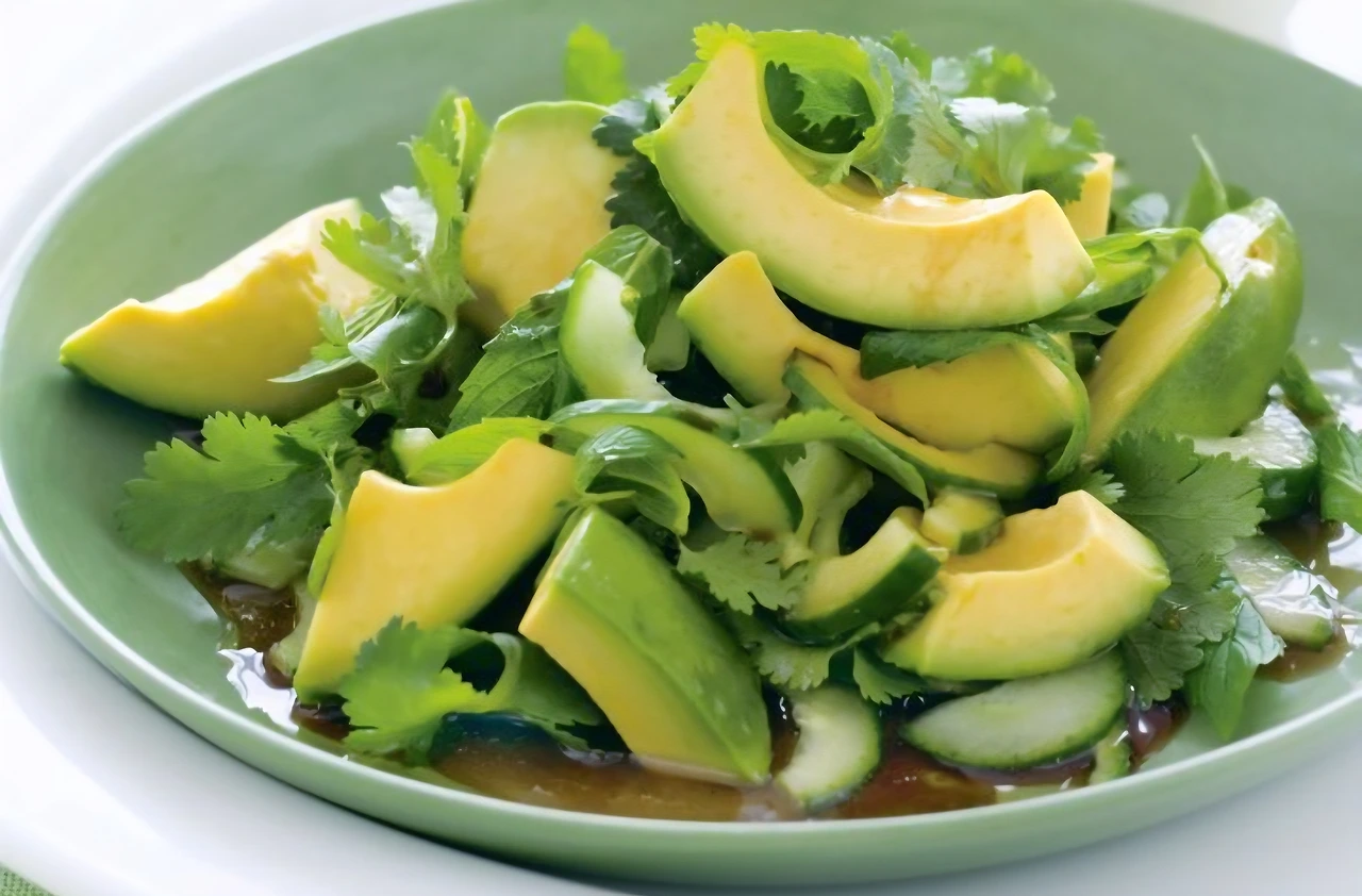 아보카도, 민트, 고수, 오이를 볼에 넣습니다. 드레싱을 부어 살살 버무립니다. 바비큐 생선, 닭고기 또는 돼지고기와 함께 드시면 더욱 좋습니다.