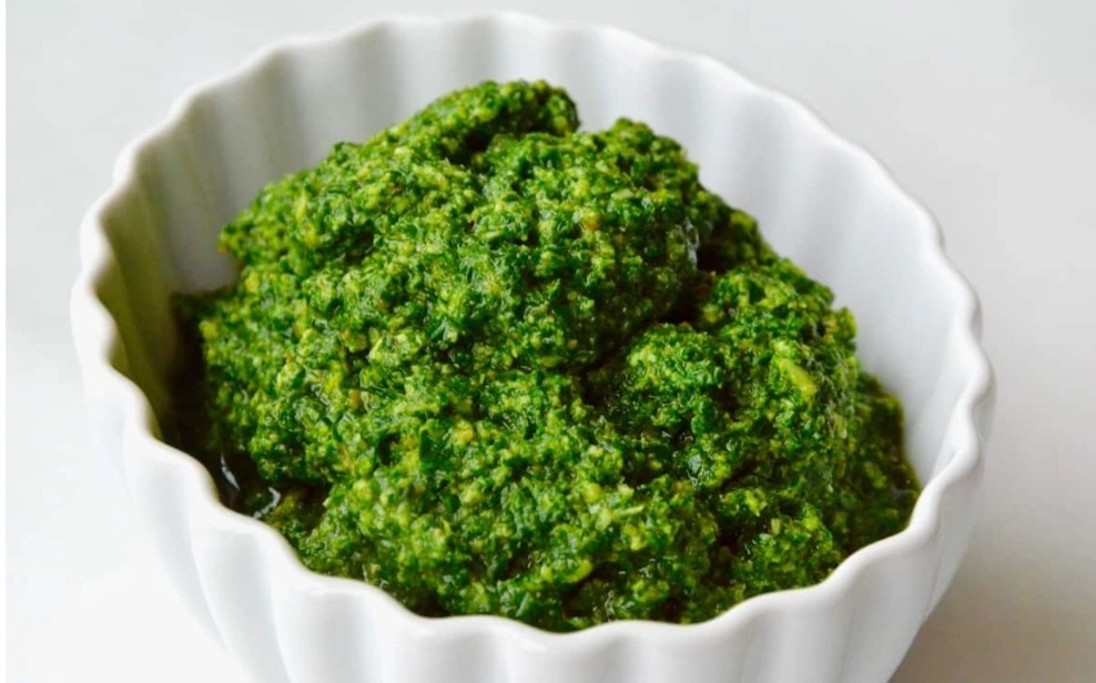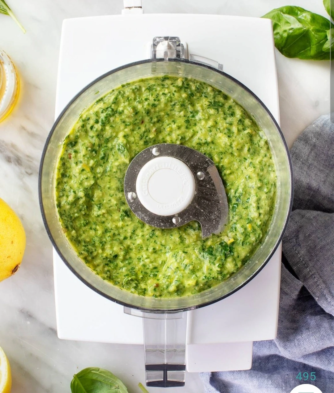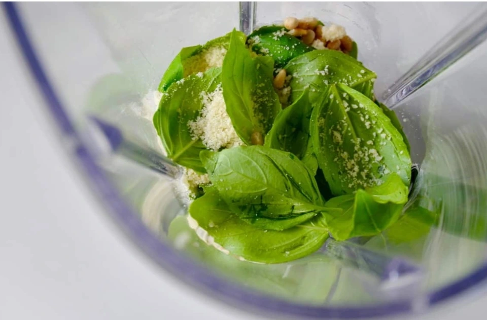 (바질 잎, 볶은 잣, 다진마늘, 올리브 오일, 파마산치즈 그리고 소금 1작은술)