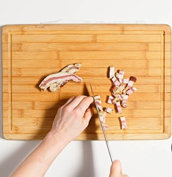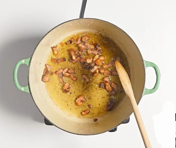 그 사이 중불로 달군 프라이팬에 버터를 녹이고 베이컨을 넣습니다. 4분 또는 노릇노릇해질 때까지 볶습니다. 마늘과 로즈메리를 넣고 약 1분 또는 향이 날 때까지 저어가며 볶습니다.