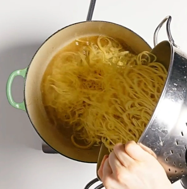 소금(약 2큰술)을 넣은 물을 끓이고 파스타 375g을 넣어 약 8분간 또는 부드러워질 때까지 익힙니다. 그리고 삶은 면을 체에 밭치고, 약간의 면수를 남깁니다.