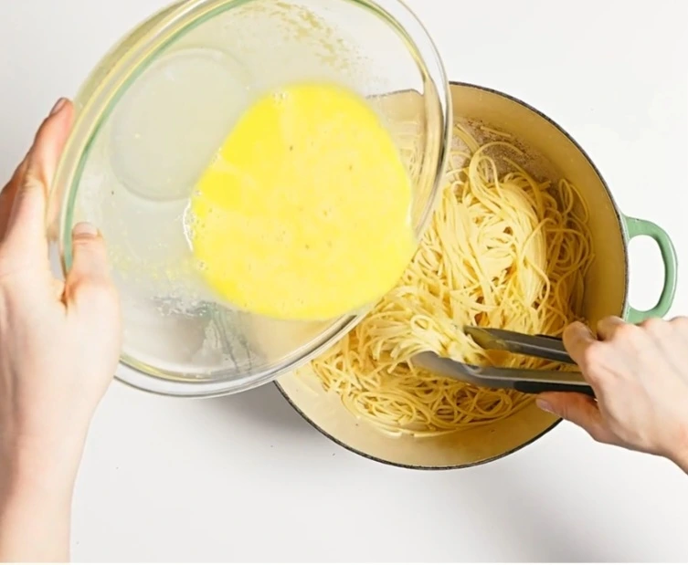 노른자와 치즈를 천천히 넣으며 면과 함께 버무릴 때,