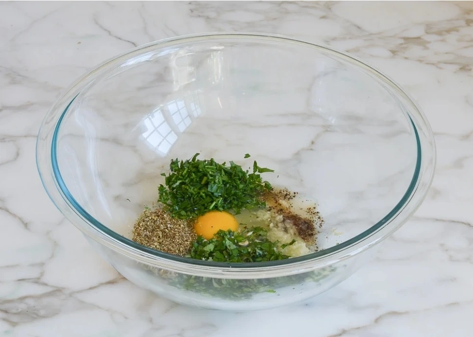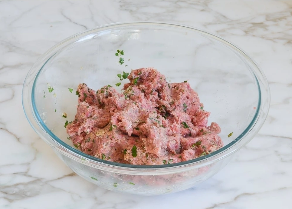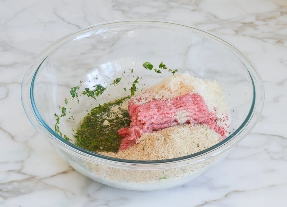 큰 볼에 다진 고기, 빵가루, 달걀, 다진 마늘, 양파, 치즈, 허브, 소금·후추를 넣고