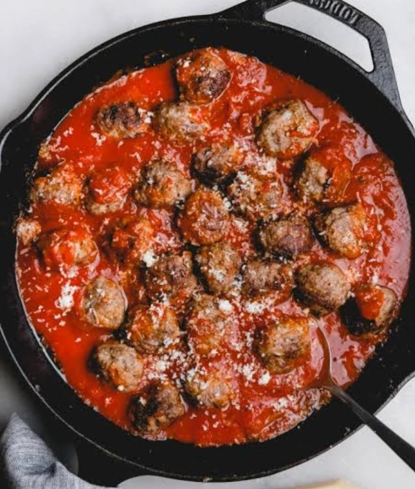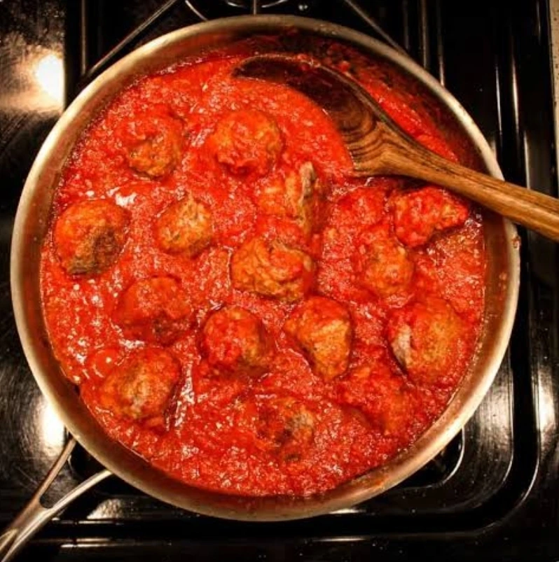 같은 팬에 약불에 약 3분간 마늘을 볶다가 토마토소스를 붓고, 소금·후추·설탕으로 간을 맞춘 후, 끓기 시작하면 구운 미트볼을 넣고 뚜껑을 덮고 10~15분간 조리합니다.