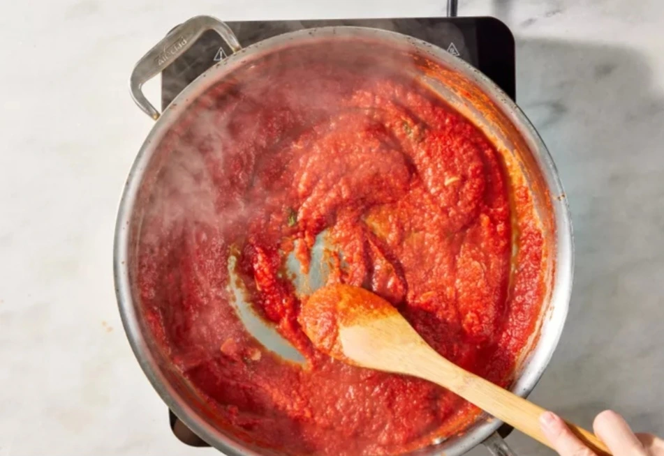 레드 와인 식초와 토마토 통조림을 넣고 으깬 뒤, 약불에서 15~20분간 걸쭉해질 때까지 끓입니다.