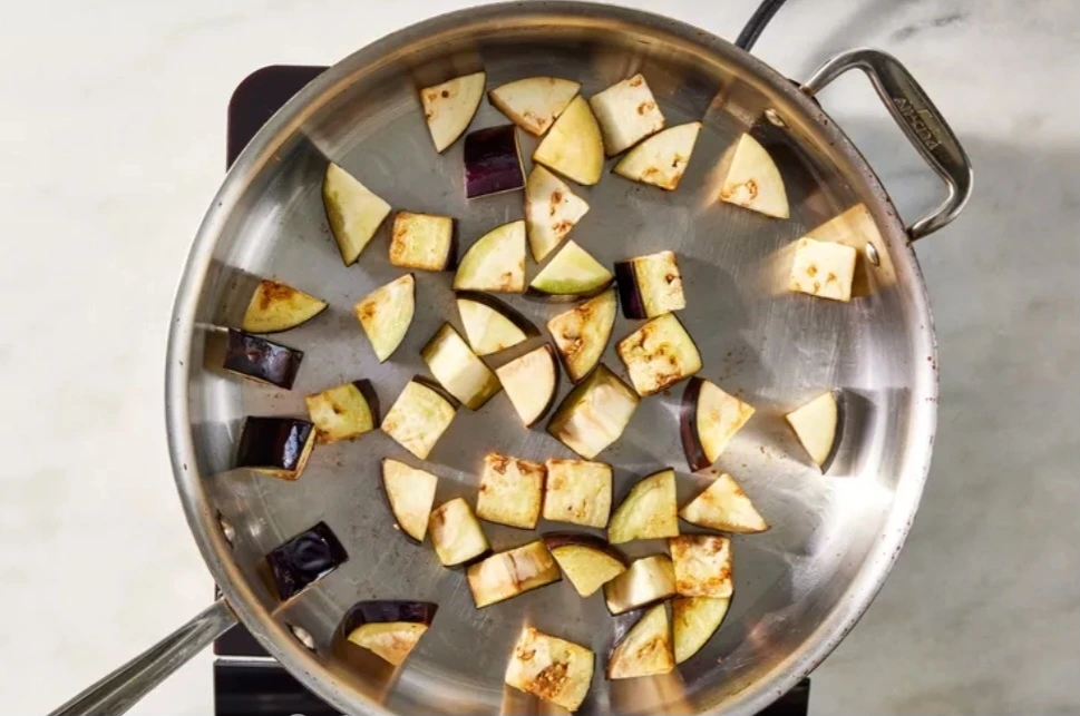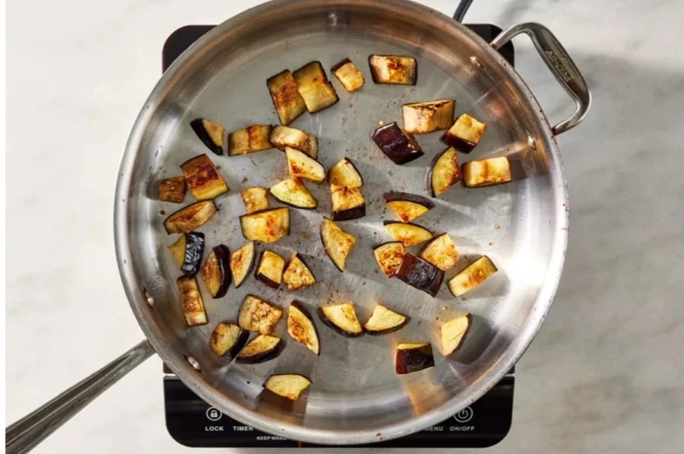 팬에 올리브유를 두르고 중불에서 가지를 펼쳐 5~8분간 노릇하게 볶습니다. (필요 시 나눠서 조리)