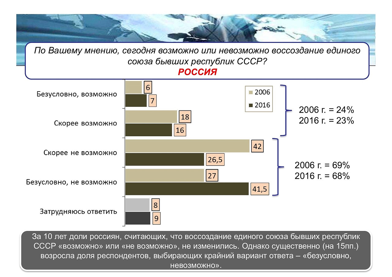 과러 소련을 구성했던 국가들, 차례로 러시아, 아르메니아, 우크라이나, 몰도바, 카자흐스탄의 같은 질문에 대한 대답이다. 러시아와 카자흐스탄이 '가능하다'가 각각 23%, 24%로 가장 높고 우크라이나가 9%로 가장 낮다. 모든 국가에서 60% 이상의 응답자가 '불가능하다'라는 의견을 내놓았다.
