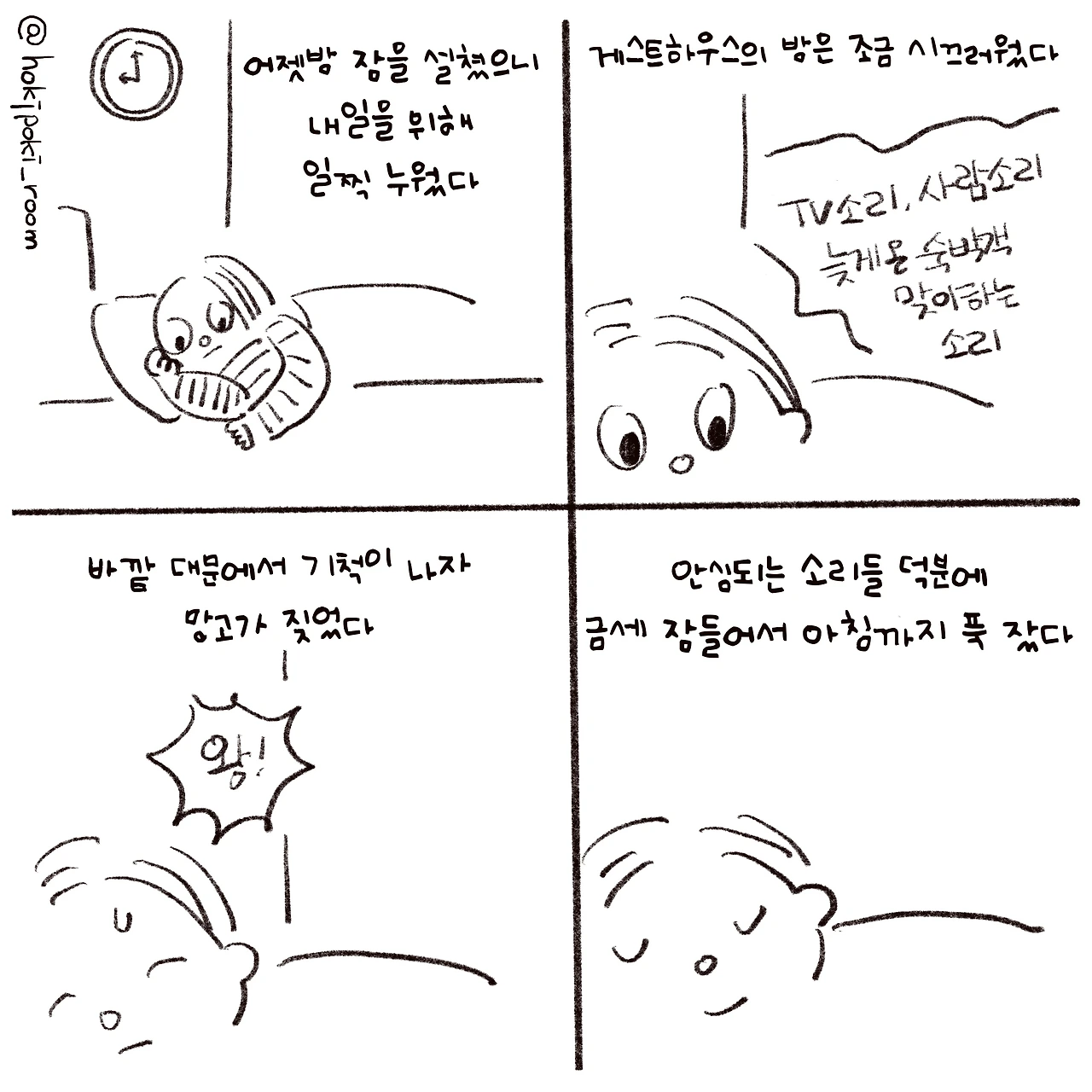 돌아다니는 며칠 내내 밤에 두세 번은 꼭 깨고 잠을 설쳤다. 하지만 이날은 집에서처럼 푹 잤다. 바깥에 안전한 이들이 있다는 안심이 커서 문을 향해 신경이 곤두서지 않았다. 집에서 항상 내가 금방 잠드는 모습을 보며 불면증이 있는 가족이 “너는 사실은 태생이 둔한 사람인 것 같다”라고 부러워했다. 아무도 나를 해치지 않으리라 안심해서 그렇게 잘 수 있는 거였구나 생각했다.