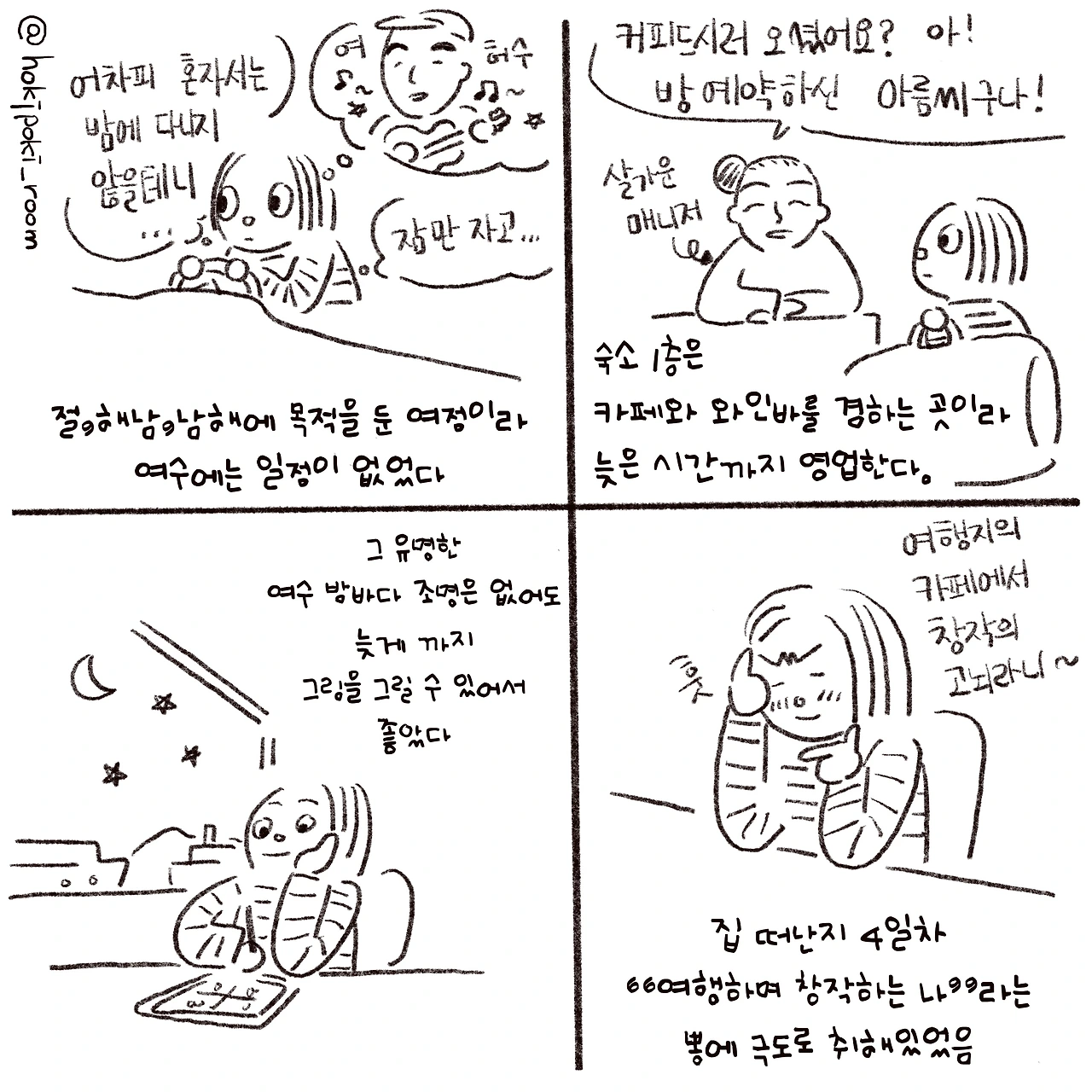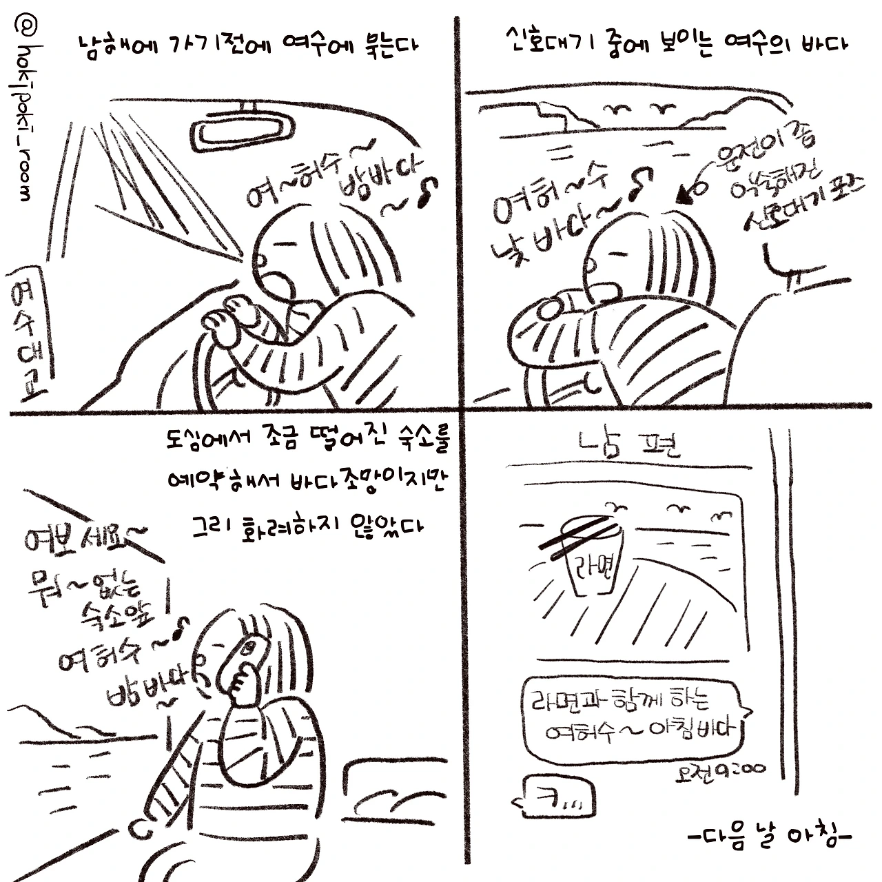 여수로 가는 길에 브런치 작가로 등록되었다는 메일이 왔다. 무언가 새로운 일이 생긴 것 같은 기분에 괜스레 들떴다. 잘해보고 싶다는 생각에 조금 부담이 생겼다. 결국 난 당장 하고 싶은 게 아니라면, 앞날을 기대하며 노력할 정도의 지구력이 아직 없다는 것을 알았지만. 나를 위해 그려야 그릴 수 있고 나를 위해 써야 쓸 수 있다. 그러기 위해 나에 대한 기대를 어떻게 해야 더욱 줄일 수 있을까. 대단한 무언가를 하지 않아도 나를 위해. 나의 즐거움을 위해.