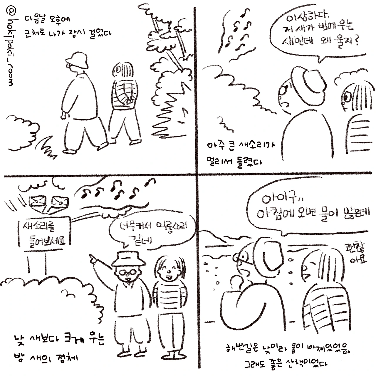 도대체 왜 살아있는 새보다 녹음된 새소리가 크게 들려야 하는가 골똘해지는데, 스님은 이유가 있겠지.라고 하며 지나갔다. 모든 이유를 죄다 알 필요는 없겠지.