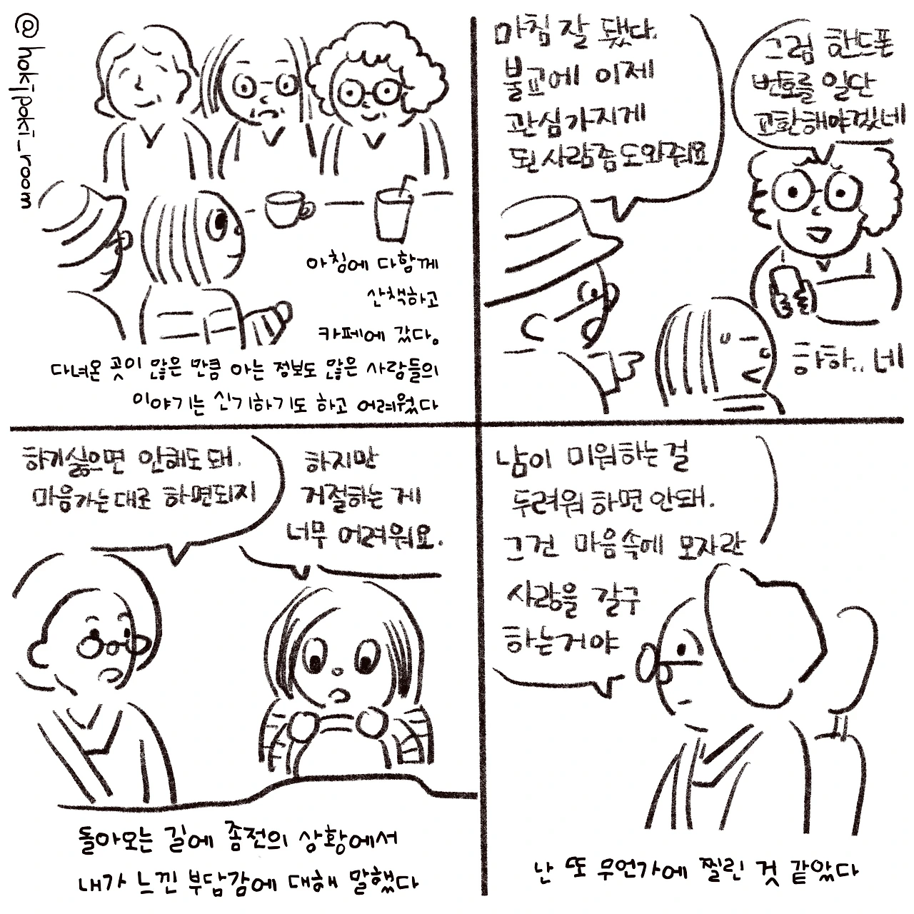 여행을 하고 만화를 그릴 수록, 내가 과거의 나를 찾아다니고 있는 것처럼 느껴졌다. 과거의 과제를 완수한다고 해도 그리 달라질 건 없다는 생각과 그래도 마음에 남은 미완을 메꾸고 싶다는 생각이 오고 갔다. 그나마 위로가 되는 건 구멍이 커지기 전에. 더 늦기 전에 내가 메꾸려는 노력을 시작했다는 점이었다.