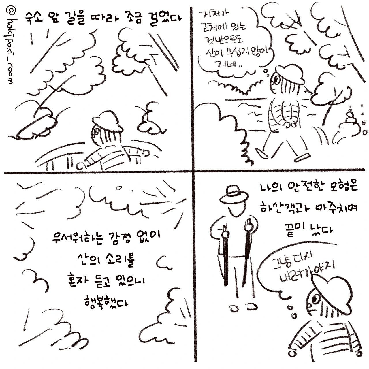 하지만 이 날은 그것과 상관없이 걸었다. 숙소가 멀어지고 나무에 가려 길이 점차 어둑해지는 것도 잠시 잊어버린 채 계속 걸었다. 점점 혼자가 되는 기분이 좋았다. 음악을 들으며 내려오는 하산객과 마주치고 나서야 내가 숲에 있다는 걸 떠올렸다. 그러자 무서워졌다. 혼자 있기 위해 온 곳에도 누군가와는 결국 마주 칠 수밖에 없었다.