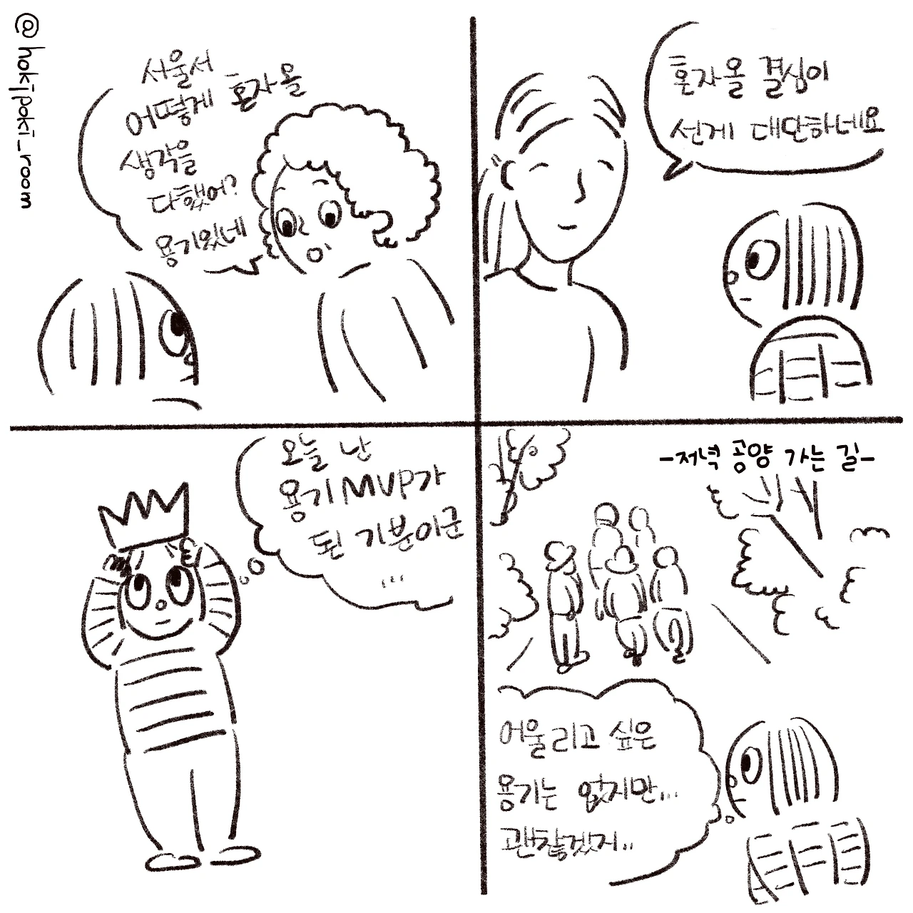 중년의 참가자 분들 중 한 명이 함께 걷던 중에 말했다. “나도 더 빨리 그렇게 했으면 좋았을 텐데. 사는데 치여서 그러질 못했고, 하고 싶은 대로 해도 된다는 걸 몰랐어.”