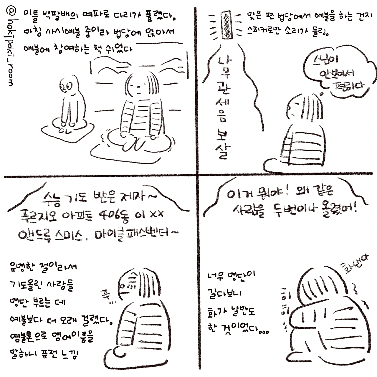 절에서 예불이 끝날 때 기도 올린 사람들의 이름을 불러준다는 것을 처음으로 알게 되었다. 내가 기도하지 않는데 누군가 나의 이름을 불러주는 게 과연 의미가 있을까 생각하다가 곧 누군가의 마음에 의미가 되겠지. 생각했다. 의미를 찾으려 하면 모든 게 의미 있고, 의미 없다 여기면 모든 게 의미가 없는 일이 되어버린다.