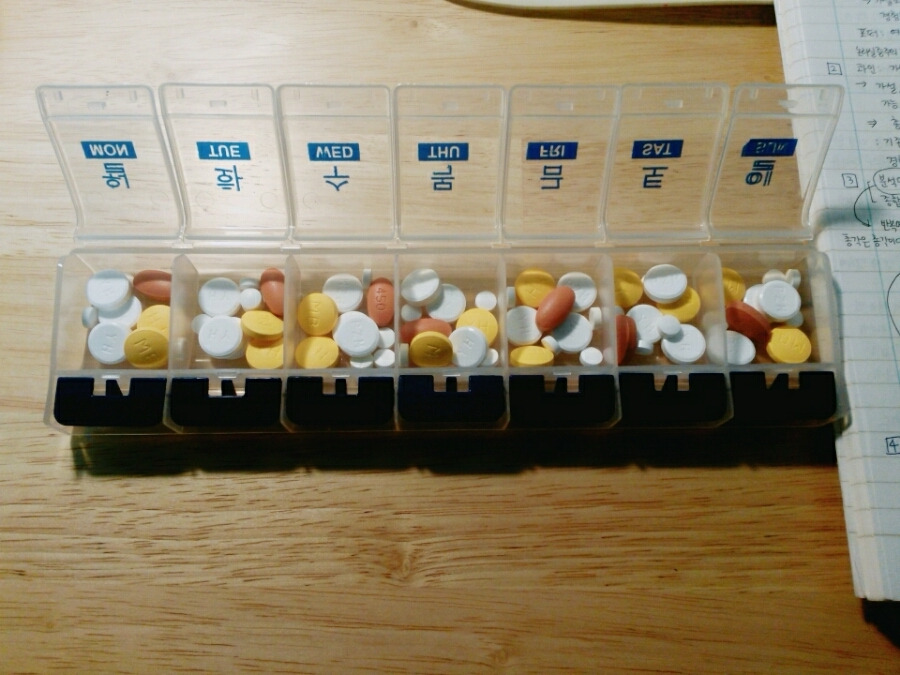 한 번에 먹는 약의 숫자다. 매일매일 까먹지 않기 위해 약통을 두고 먹었다. 처음에는 약이 너무 많아 한 번에 먹지 못했다. 한 번 시도했다 기도가 막혀 죽는 줄 알았다.