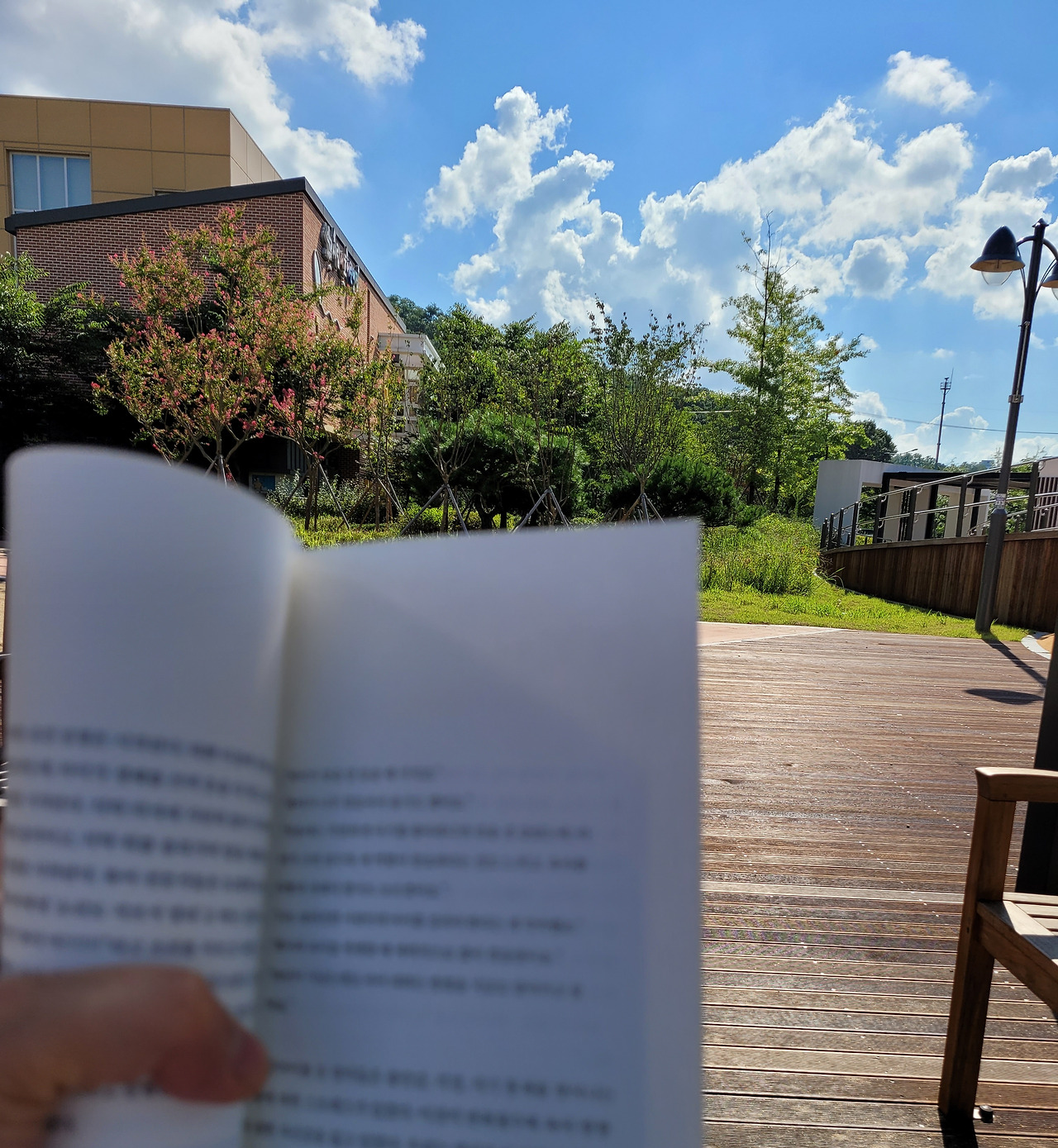 텀블러에 백포도주와 얼음을 담고 모기 기피제를 뿌리고 책 한 권을 가방에 넣어 그늘 진 공원 벤치에서 읽고 가끔 고개를 들어 반질반질한 코트 위에서 농구하는 아이들과 조그만 아이가 헬멧을 쓰고 아빠와 킥보드를 타고 다니는 걸 지켜봤을 것이다.