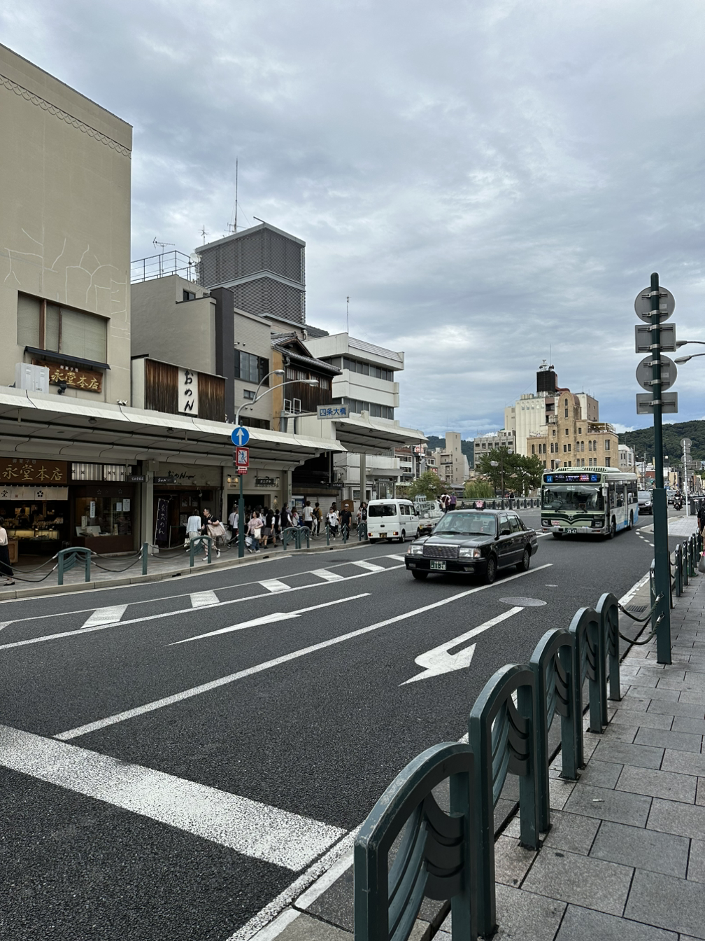 점심 식사를 마친 우리는 캐리어 세 개를 끌고 교토역 앞에서 시내버스를 탔다. 숙소가 있는 기온까지는 약 2,30분이 소요되었는데, 3시가 되지 않은 시간이었지만 교복을 입은 학생들로 버스는 점점 꽉 차게 되었다. 큰 캐리어 두 개와 작은 캐리어 하나를 끌고 버스에 탄 우리는 교토의 주민들에게 조금 미안함을 느꼈다. 오는 날 같은 버스에 타고 알게 되었는데, 교토에서는 여행객을 대상으로 '택시 타기' 캠페인을 진행 중인 것 같았다. 버스 창문에 붙어 있던 손바닥 두 개만 한 스티커에는 '캐리어를 끌고 온 여행객은 다른 승객들을 위해 택시 사용을 권장한다'는 내용이 영어로 쓰여있었다. 뒤늦게 이 사실을 알게 된 나는 커다란 캐리어를 최대한 내 자리 사이로 구겨 넣으며 통로를 넓히는 것으로 미안한 마음을 조금이나마 표현했다.