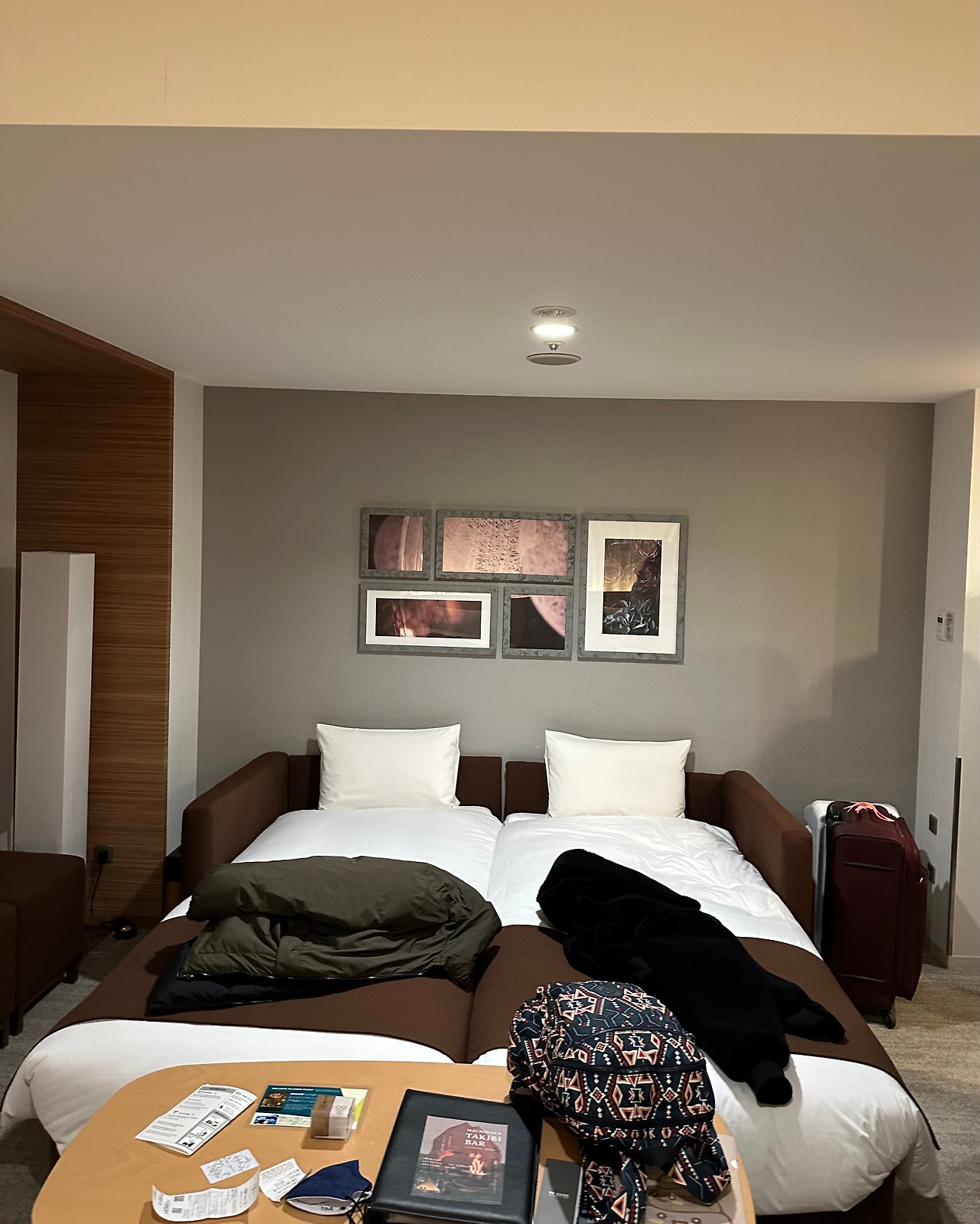 네 명이 잘 수 있는 객실 '이그제큐티브 쿼드러플룸'. 슈퍼싱글 정도 사이즈의 침대 두 개는 기본으로 제공된다. 나머지 침대는 예약할 때 '소파' 혹은 '침대' 중에 '침대'로 설정하면 소파베드를 펼쳐서 세팅해 준다. 소파베드까지 펼치면 객실이 좀 좁아 보인다. 그래도 작은 소파나 테이블을 이용하면 충분히 캐리어를 펼칠 수 있다. 침대와 소파베드 사이에 테이블을 놓고도 양 옆으로 사람이 지나다니기에는 충분했다. 만약 네 명이 테이블에 둘러앉아 음식을 먹고자 한다면 앉은자리에서 테이블까지 거리가 애매하게 멀어서 불편할 것이다.