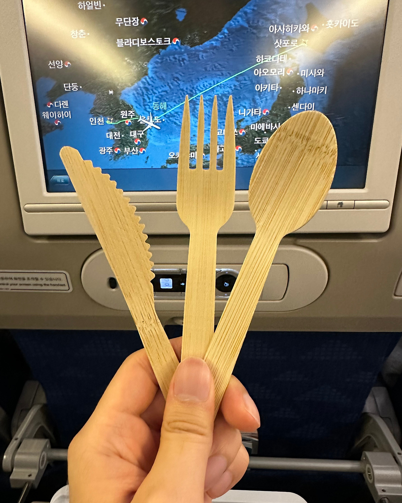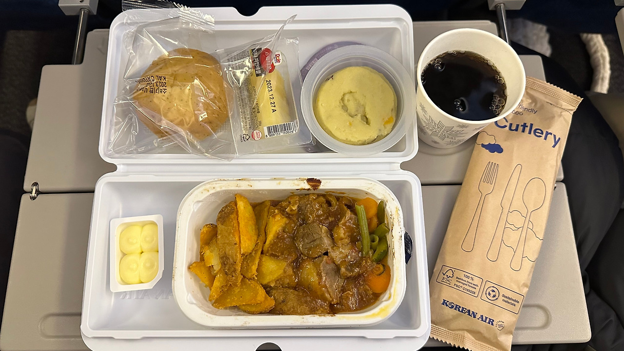 기내식은 고기 스튜(?)와 웨지 감자. 대나무로 된 커틀러리가 인상적이었다.
