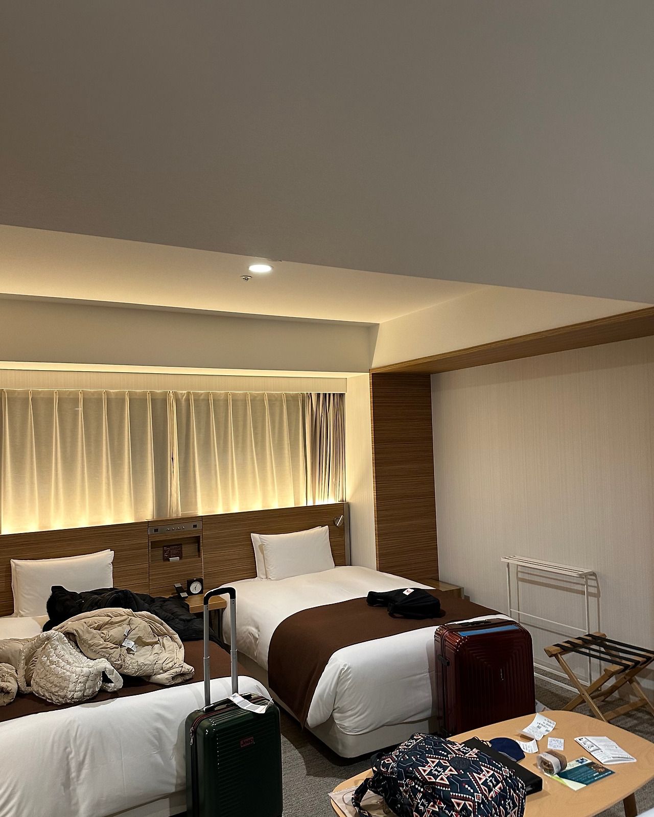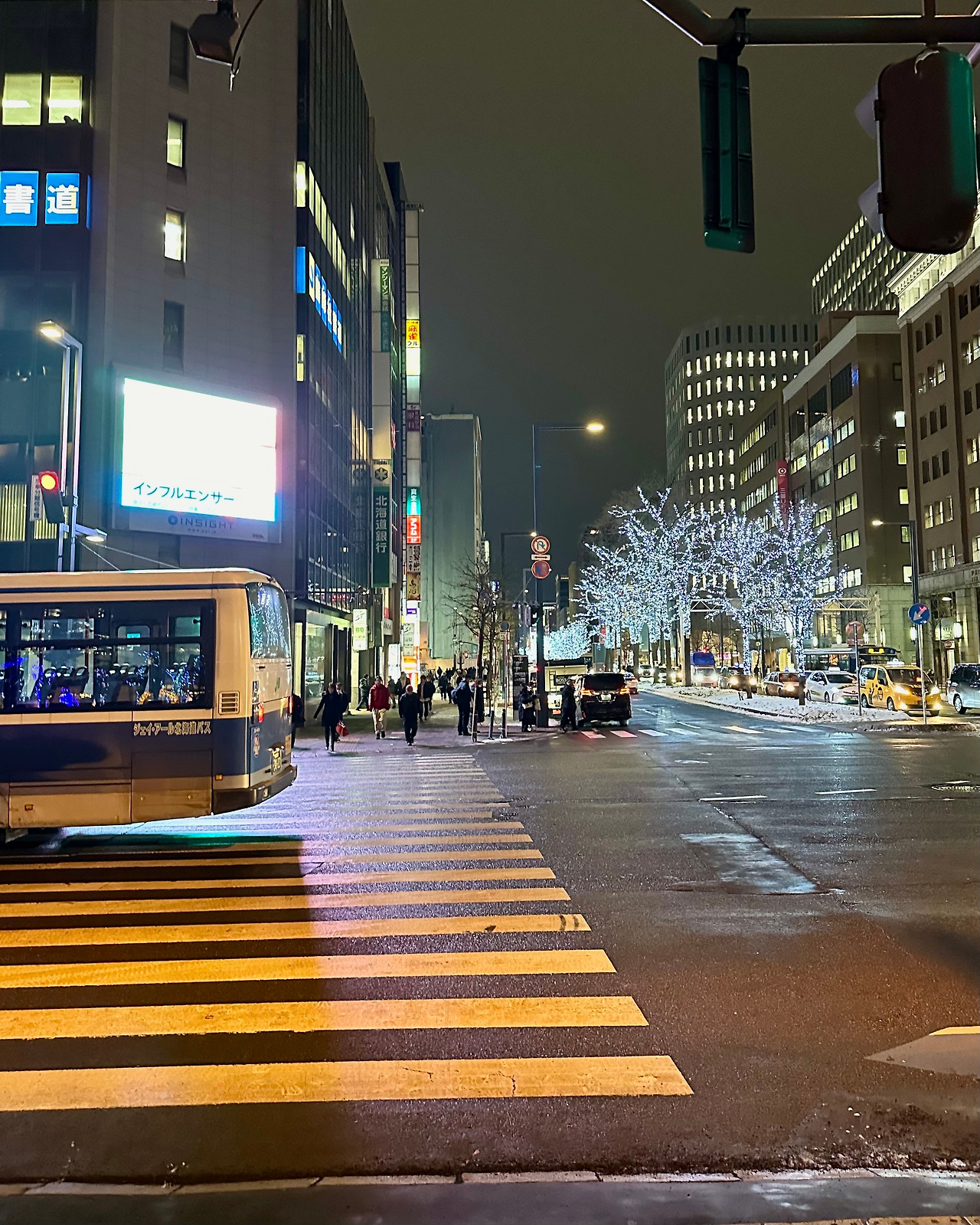 신치토세 공항에서 삿포로역에 도착한 시간은 오후 다섯 시. 한국에서는 초저녁이 되기도 전인 시간이지만 삿포로에는 이미 밤이 찾아왔다. 이 시기에 삿포로에는 기대한 만큼 많이 눈이 오진 않았다. 화이트 크리스마스였던 서울과 비교했을 때 쌓인 양은 비슷한 정도였다. 새하얀 도시를 기대했던 엄마는 살짝 실망한 것 같았다. 출발 지연에 지치고 회색 도시에 실망했지만, 그래도 설레는 여행의 시작이었다. 삿포로역 앞에서 셀카를 찍고 난 후, 우리 가족은 숙소로 걸음을 옮겼다.