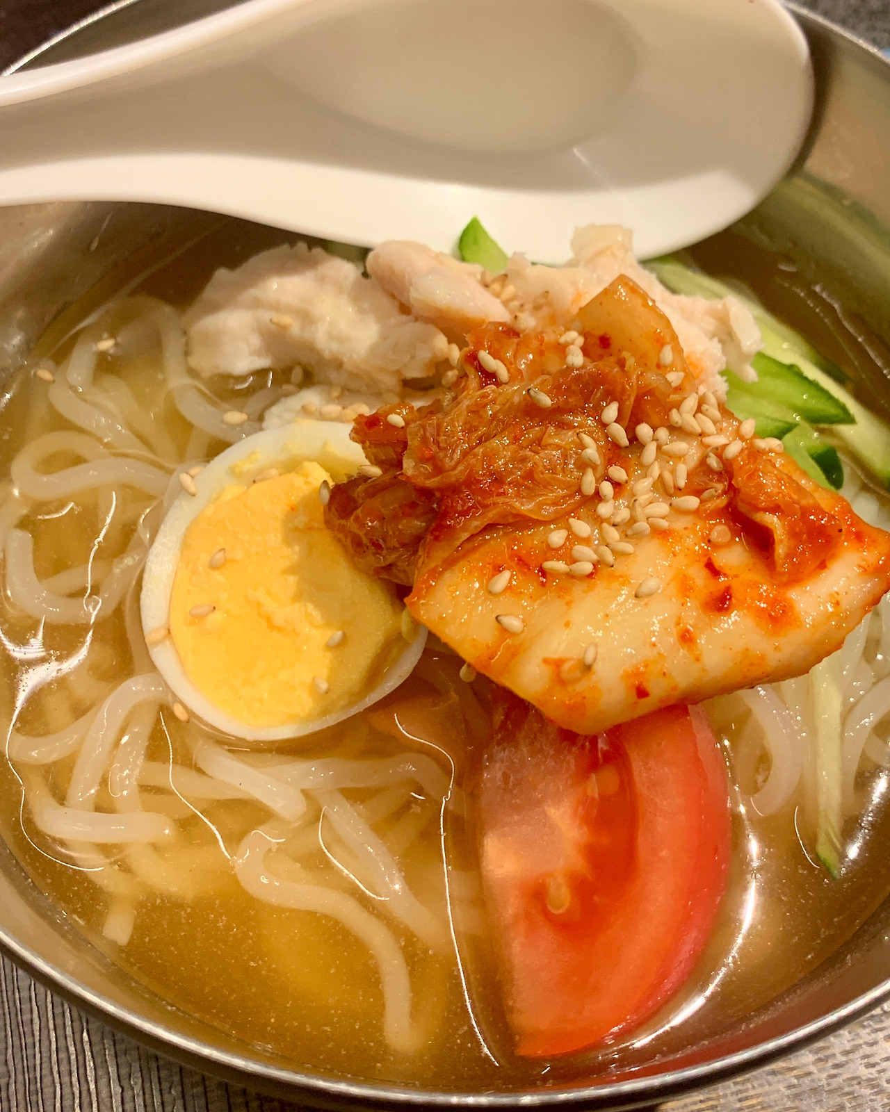 모자란 양을 채우기 위해 냉면과 육개장을 주문했다. 냉면은 당당히 '냉면'으로 소개되어 있고, 육개장은 음식 이름은 보지 못했지만 메뉴판 사진이 누가 봐도 육개장 같았다. 우선 육개장은 맛은 괜찮았지만 육개장 맛은 전혀 아니었다. 오히려 '참깨라면' 국물맛과 너무 똑같아서 놀랐다. 한국인 입맛에 맞추기 위해 참기름이나 들기름 같은 것을 넣은 것일까. 냉면은 비추. 냉면 역시 전형적인 냉면 육수 맛과는 전혀 달랐는데, 굳이 설명하자면 오이냉국과 냉면 그 사이의 오묘한 맛이었다. 면발 하나는 탱글했지만 국물은 마실수록 별로였다. 한국에서 먹듯이 후식으로 냉면을 시킨다면 후회할 가능성이 높다.