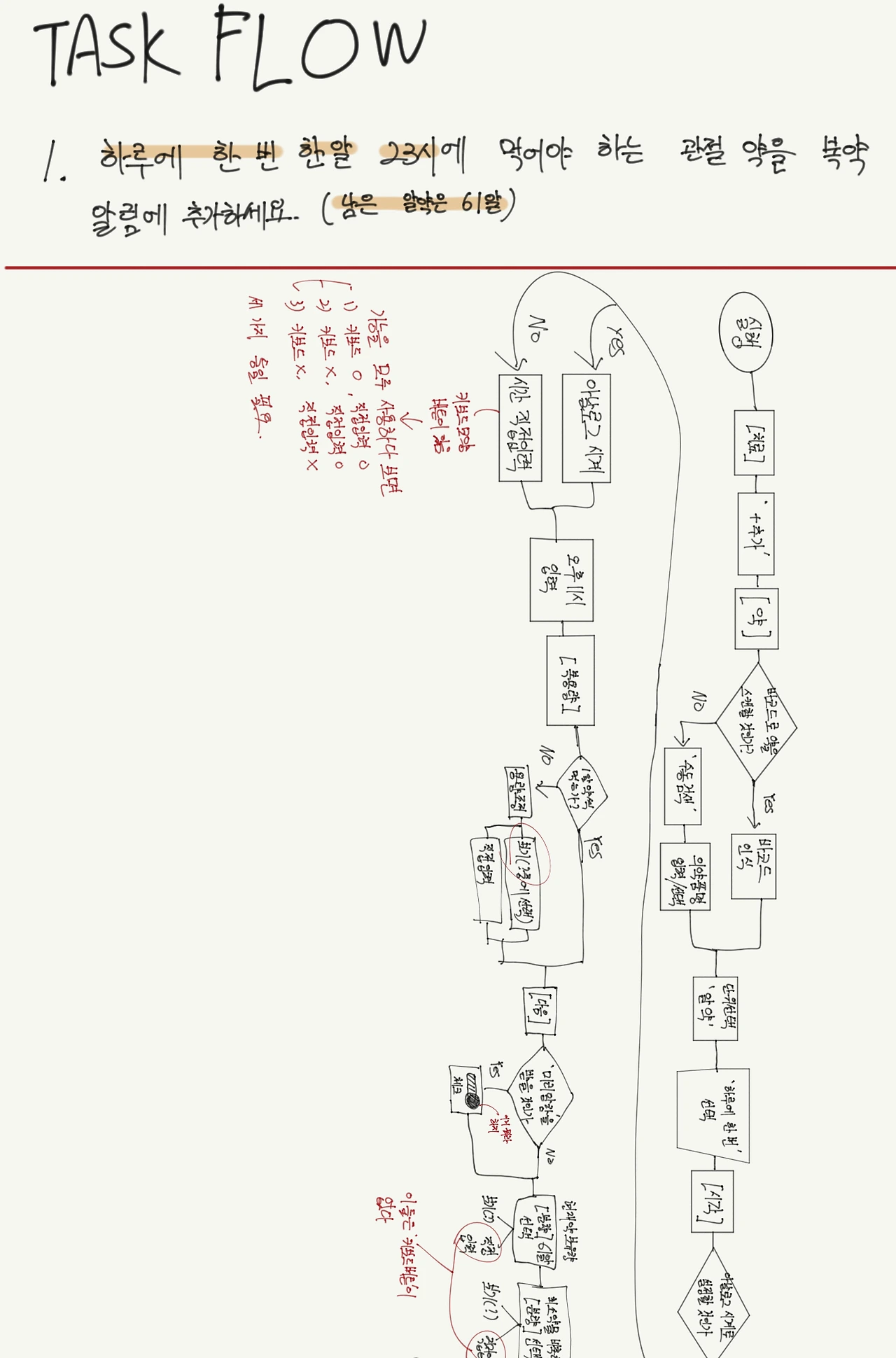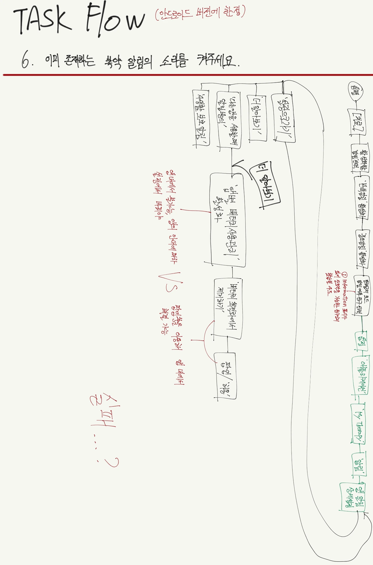 'My Therapy'를 통해 사용자가 진행할 수 있는 task 7가지를 정하고 그 과정을 그림으로 나타내 보았다. 각 task마다 간단한 상황을 설정해서 사용자가 task를 수행하는 과정에서 겪을 수 있는 어려움을 살펴보고자 했다. Task Flow는 작업 수행의 '정도(正道)'라고 할 수 있는데, 사실 task flow 설정 후에 실제로 사용자에게 task를 수행하게끔 하고 그 과정을 관찰하는 것이 더 정확한 방법이지만 지금으로서는 이 단계를 프로토타입 제작 이후로 미루기로 한다.