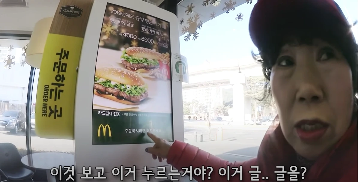 위 영상은지난 2019년에 업로드된 박막례 할머니의 영상이다. 박막례 할머니는 다양한 것에 도전하며 많은 이들에게 영감을 주고 계시는 분이다. 구글 CEO까지 만나셨던 박막례 할머니시지만 기계로 햄버거를 주문하는 것은 꽤나 무서운 도전이었던 것 같다. 박막례 할머니의 키오스크 주문 도전 영상을 바탕으로 '노인의 키오스크 주문 과정에서 겪게 되는 어려움'에 관해 분석해 보고자 한다.