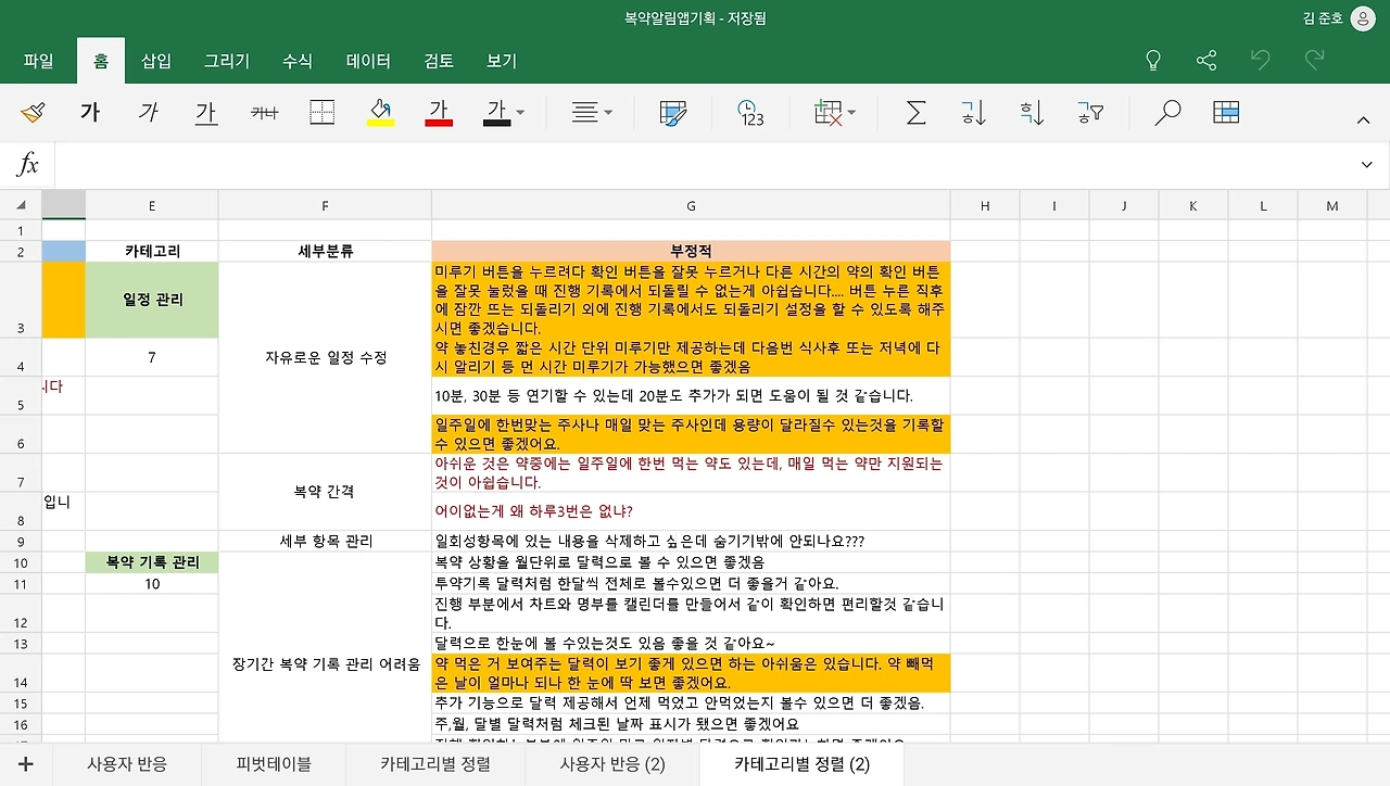 위 방법에 따라 플레이 스토어의 사용자 리뷰를 다음과 같이 엑셀에 정리하였다.