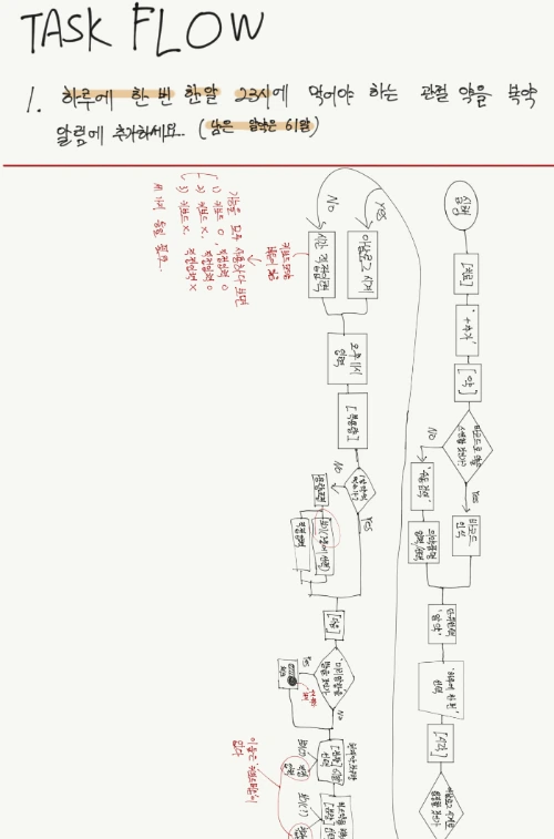 앞선 포스팅에서 먼저 소개한 일곱 가지의 태스크 플로우는 '사용자 반응 분석' + '나의 개인적인 사용 후기'를 종합해서 작성한 것이다. 원래는 태스크 플로우를 따라 서비스를 점검할 때 사용자들이 직접 수행하는 것을 관찰해야 하지만, 이번 프로젝트에서는 내가 플로우를 따라 앱을 사용하면서 가상의 사용자가 느낄 법한 애로사항을 점검해보기로 했다.
