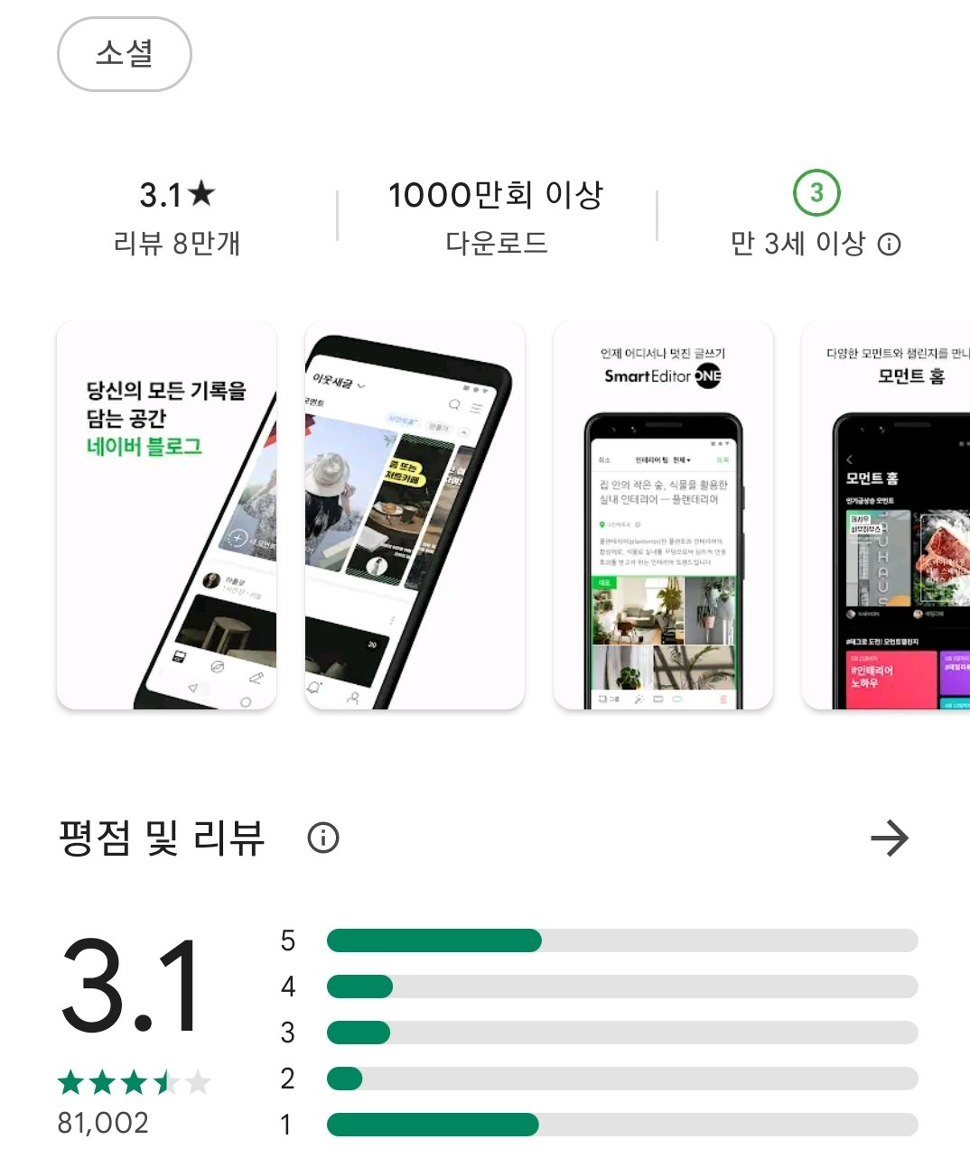 그러나 사용자들은 앱을 포스팅 앱으로 생각하는 반면, 네이버는 위 사진에서 대놓고 써놓았듯이 네이버 블로그 앱의 소셜미디어적인 특징을 강조하는듯하다.