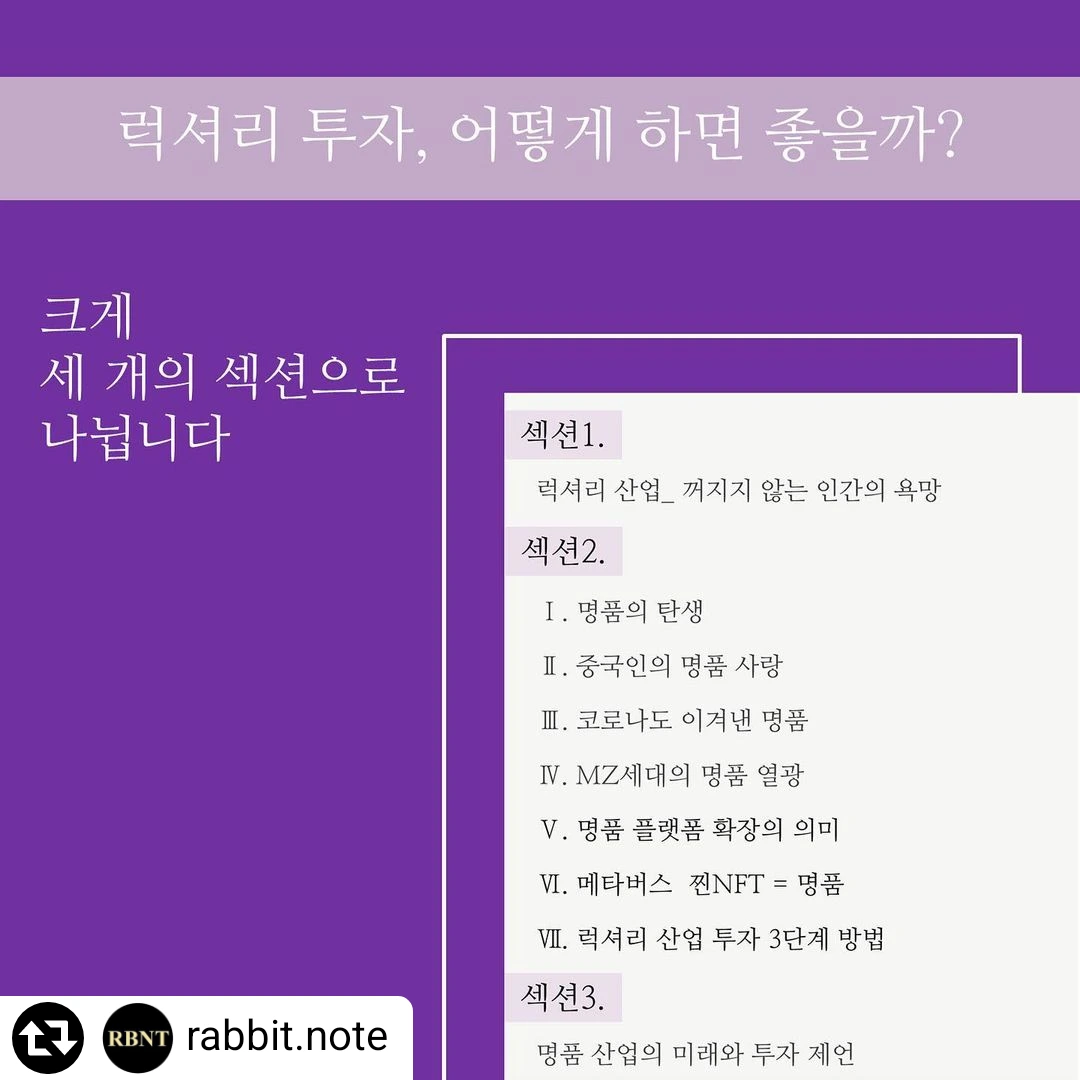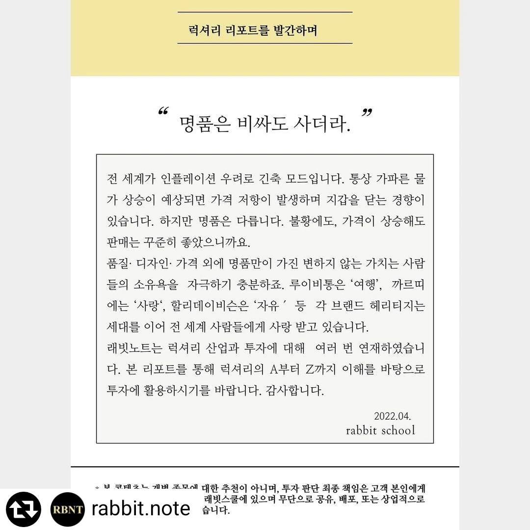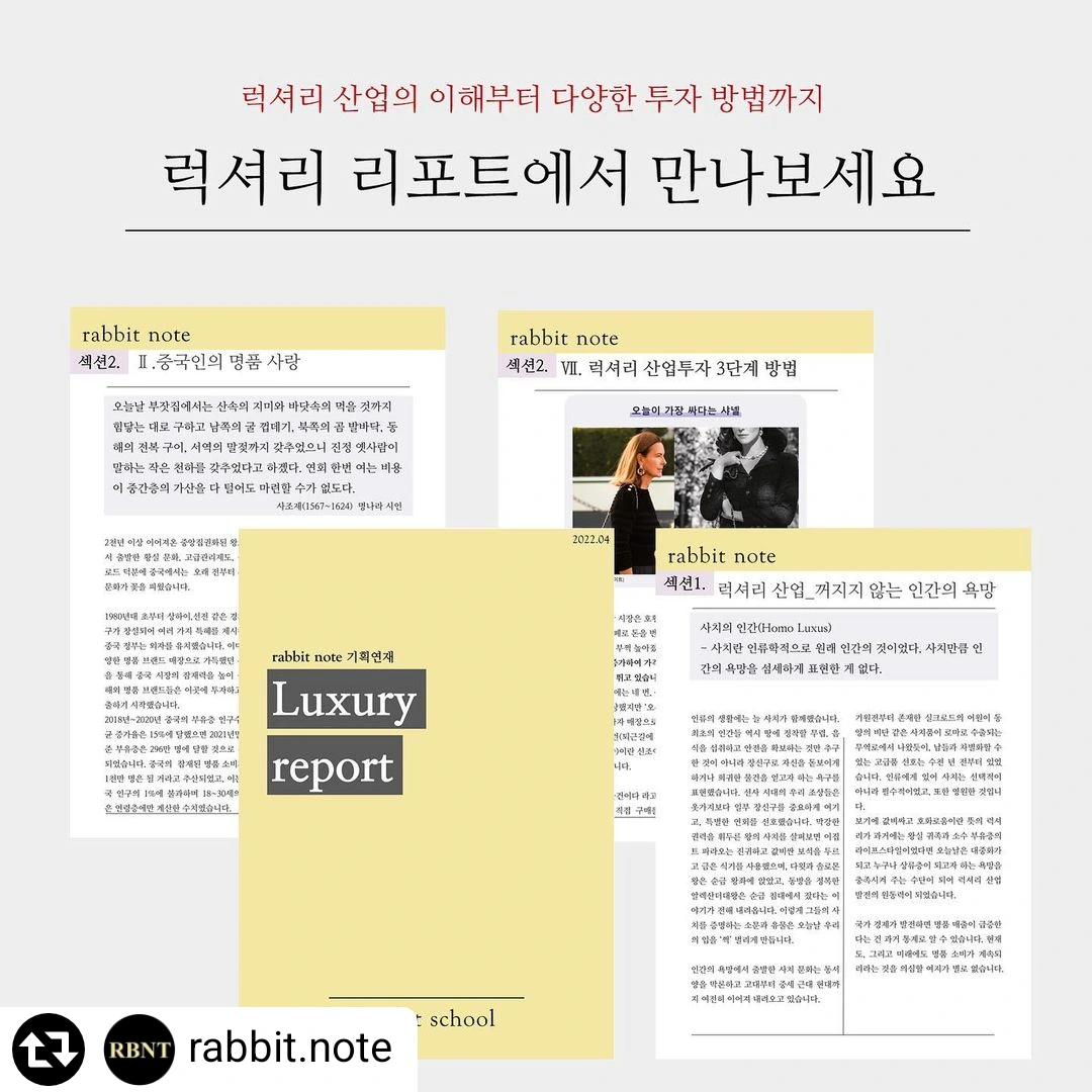 이에 역발상 투자 입장에서 지금 럭셔리를 다뤄야 한다고 래빗스쿨은 판단을 했고, 럭셔리리포트를 준비했습니다. 책은 두껍고 조각 조각 경제기사는를 연결하기 쉽지 않다면 래빗스쿨 리포트
