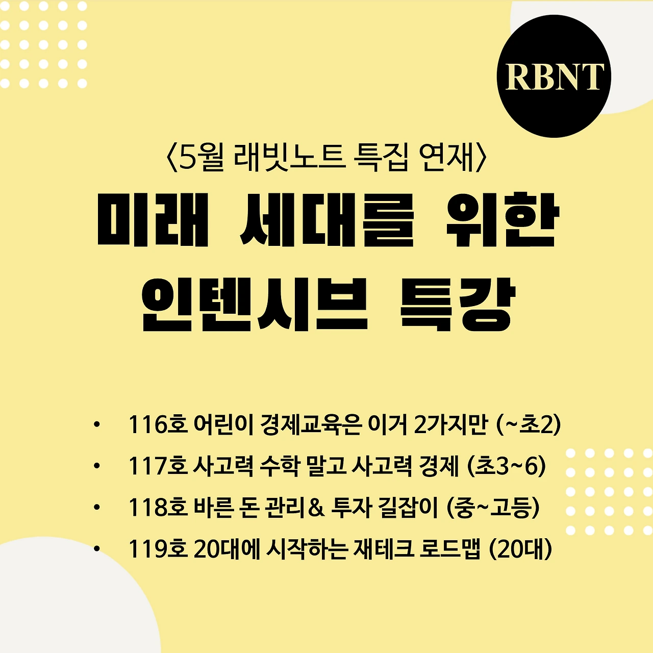 아이들을 위한 경제교육은 어렵지 않고 쉬워야 한다고 래빗노트는 생각합니다. 누구나 바로 이해할 수 있고 실천할 수 있어야 하죠. 래빗노트 116호~119호에서 누구나 실천할 수 있는 경제 교육법 알려드리겠습니다.