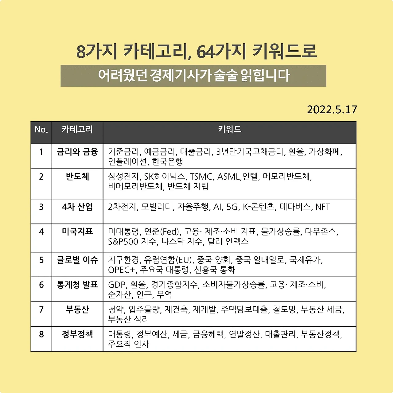 경제기사 읽기 8가지 카테고리,64가지 키워드