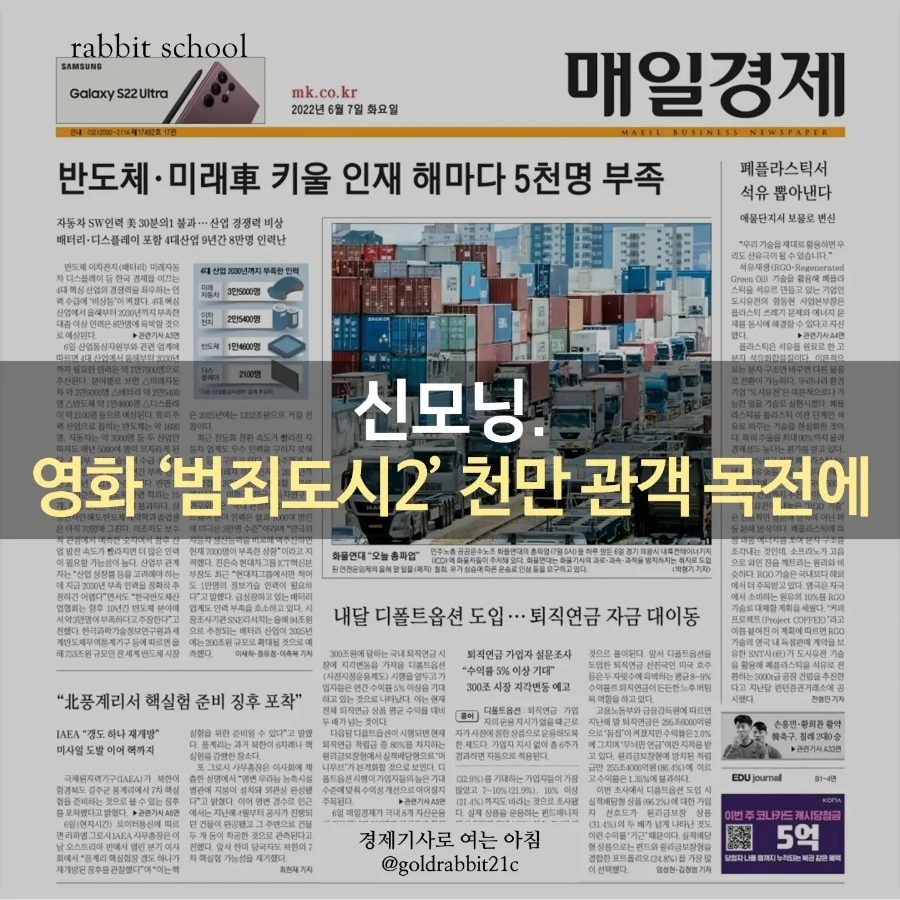 3.(중앙) 영화 '범죄도시2'가 천만관객 돌파를 눈앞에 두고 있다. 코로나19 팬데믹 이후 첫 ‘천만 영화’ 탄생이라는 점에서 의미가 있다. 왜 사람들은 잔인한 연화 '범죄도시2'에 몰려가고 있을까. 1) 구씨 때문, 2) 마블리 때문, 3) 본 사람의 50%가 추천을 했을 정도로 입소문이 좋았기 때문, 4) 범죄도시1편을 본 사람들의 기대감 때문, 5) 1편은 청불이었지만, 2편은 15세 관람가를 받았기 때문, 6) 4월25일 거리두기 해제 후 극장 취식 제한이 풀렸기 때문, 7) 그동안 억눌렸던 영화 보기 수요가 한 번에 몰렸기 때문 등등 이유가 많다. 빌런의 대사 " 너 납치된 거야"라는 말에 설레는 여성관객이 늘었기 때문도 포함해 줘야겠다. 어느새 이 영화는 '범죄도시 1편'을 본 남성과, '해방일지'를 본 여성이 함께 손잡고 가서 보고 싶은 영화가 되었고, 코로나 이후 첫 '천만 관객' 카운트에 들어갔다.