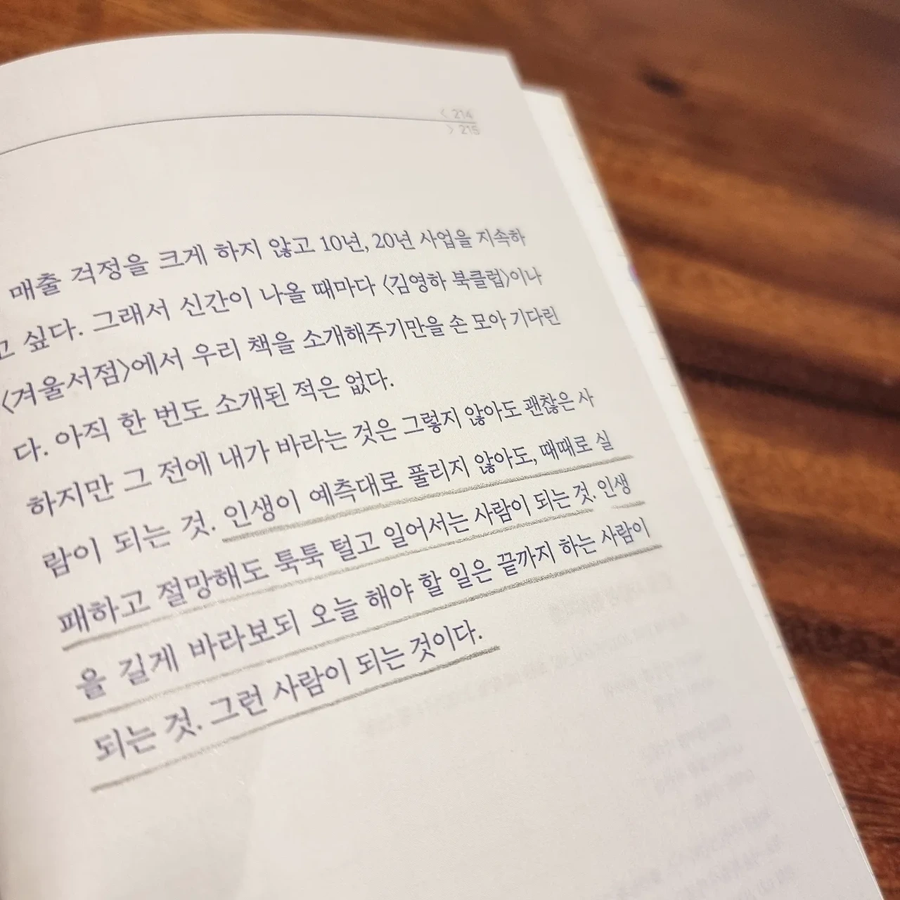 인생이 예측대로 풀리지 않아도, 때때로 실패하고 절망해도 툭툭 털고 일어서는 사람이 되는 것. 인생을 길게 바라보되 오늘 해야 할 일은 끝까지 하는 사람이 되는 것. 그런 사람이 되는 것이다. p215