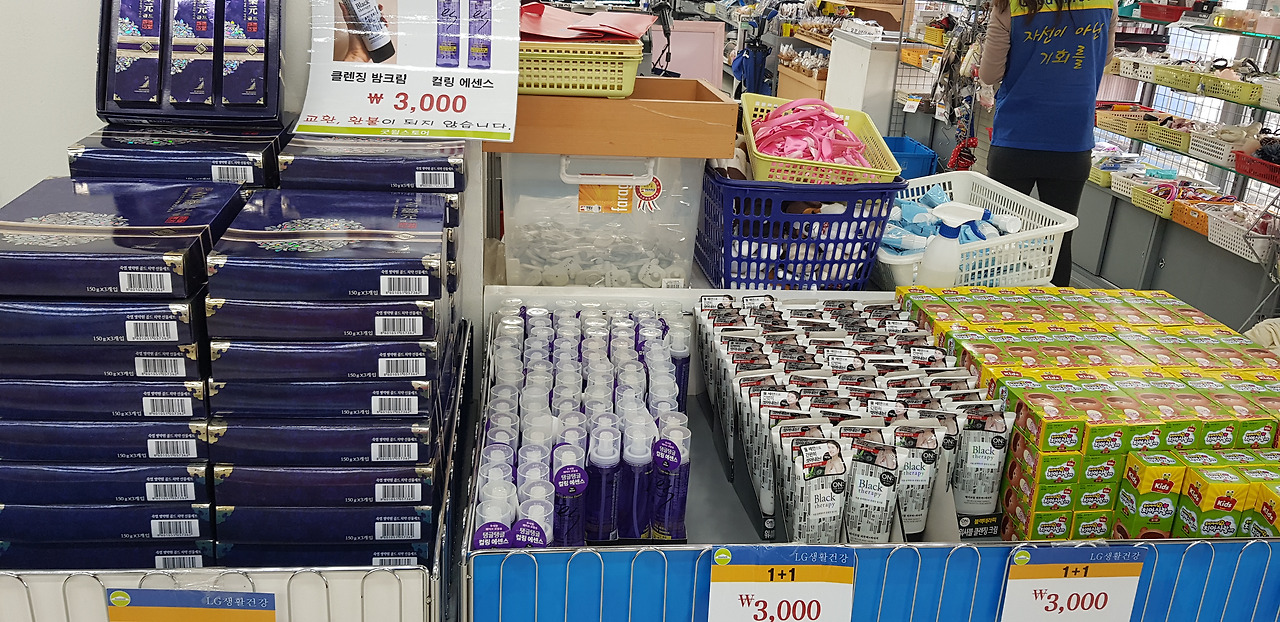 둘째, 물건이 무척 쌉니다. 기증받은 물건이기 때문에 중고품들은 말도 안 되는 가격이 붙습니다. 게다가 오뚜기와 LG생건은 따로 코너가 있을 정도로 매 번 많은 상품들을 기증해줍니다. 좋은 회사는 뭐가 달라도 다릅니다. 주방 세제나 세탁용 세제는 거의 여기서만 사고, 요즘은 오뚜기 식품도 이용하고 있습니다. 어제는 미세먼지용 마스크를 샀는데 4개 들어있는 세트가 500원(LG생건 기부품)이었습니다. 바로 전 날 약국에서 비슷한 제품을 4천 원에 샀는데 말이죠. 조카 줄 아이 책은 3권 세트가 1000원이었고요. 출판사 기부품인지 패킹된 상품이 수십 세트 들어왔더라고요. 참고로 상품은 계속 바뀝니다.