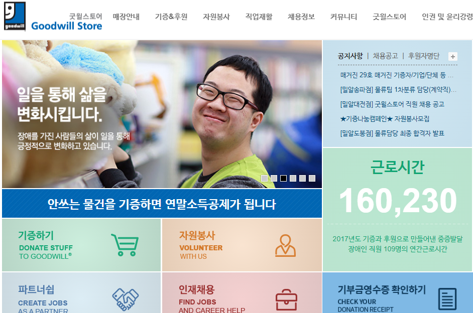 셋째, 연말정산용 기부 영수증을 받을 수 있습니다. 아무래도 직장인이었기 때문에 이 점이 굉장히 매력적이었습니다. 기부 가능한 품목은 대략 의류, 소형 가전, 도서 등이고 자세한 품목은 다음 링크를 참조 바랍니다. (http://www.goodwillsongpa.org/sponsor/support/refer-list/)