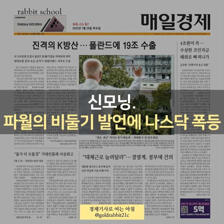 1. 간밤에 뉴욕증시는 비둘기로 돌변한 파월 의장 덕분에 빅테크를 중심으로 일제히 상승했다. 빅테크 실적발표 출발을 알린 MS와 알파벳은 2분기 실적이 컨센서스를 하회했음에도 주가가 폭등했는데, MS는 클라우드가 알파벳은 검색엔진이 일등 공신이었다. 주가는 각각 6.69%, 7.74%뛰었고, 덩달아 테슬라 6.17%, 아마존 5.27%, 애플 3.42% 상승했다. 다우존스 32197.59(+1.37%), S&P500지수 4023.61(+2.62%), 나스닥 12032.42(+4.06%)로 마감. 파월 의장이 뭐라 얘기 했냐면, “통화정책 기조가 계속 긴축으로 가면서 누적되는 정책 조정이 경제와 물가에 어떤 영향을 미칠지 고려하며 금리 인상 속도를 늦추는 게 적절할 것 같다” 라고 복잡하고도 어려운 얘기를 했다. 하지만 이건 비둘기성 발언인 걸 우린 다 안다. 일단 7월 FOMC에서 연준은 시장의 예상대로 자이언트스텝을 단행했다.