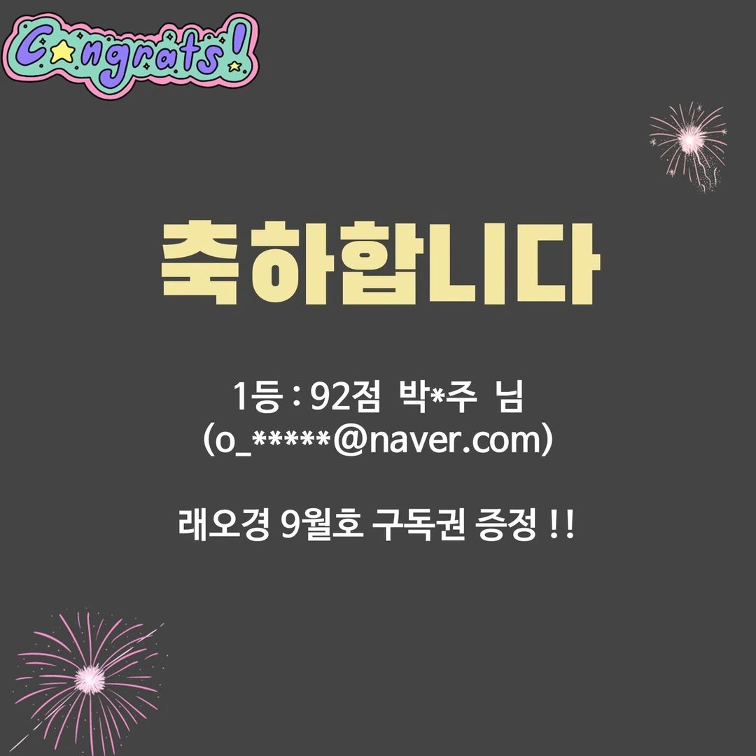 1등을 하신 박*주 님게는 래오경 9월호를 내일 보내드리겠습니다.
